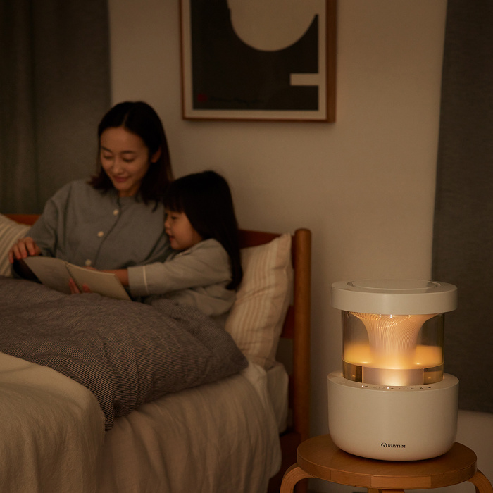 「水」が「霧」になり「湿度」に変化する一連の流れをあかりとともに演出し、パブリック空間を清潔に加湿する「MIST 350」でくつろぎの時間をお楽しみください。
