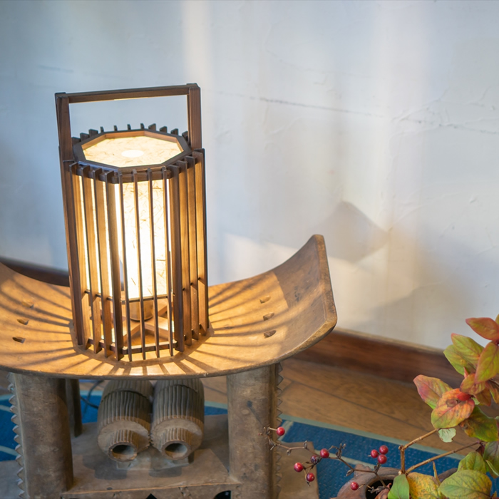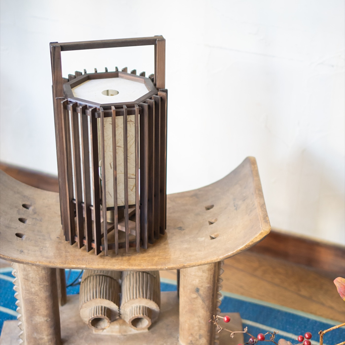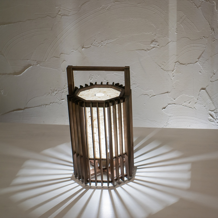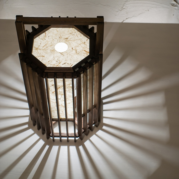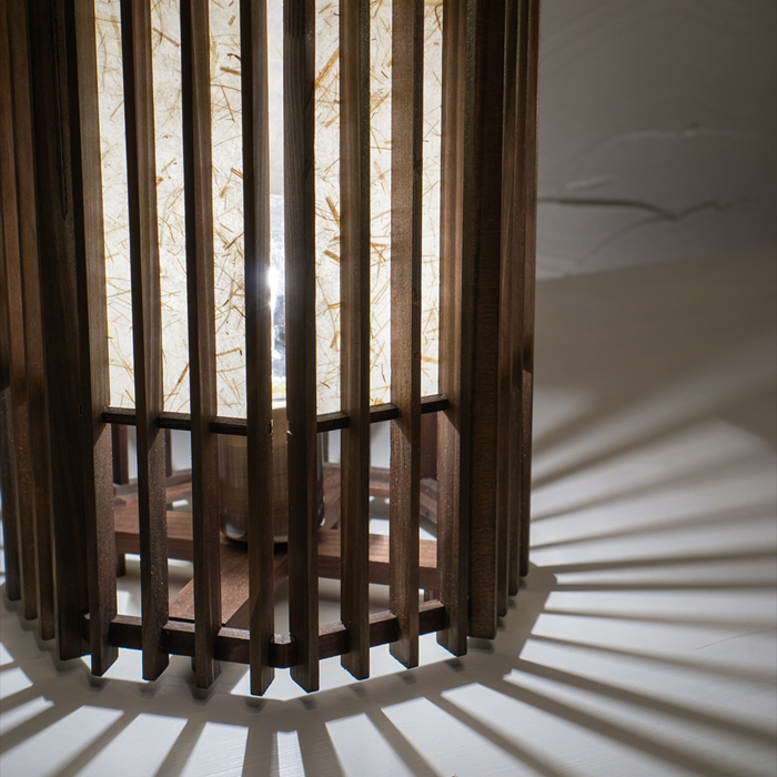 足元に放射状に広がる縦格子の影と、柔らかく光るワーロンの対比も美しいスタンドです。