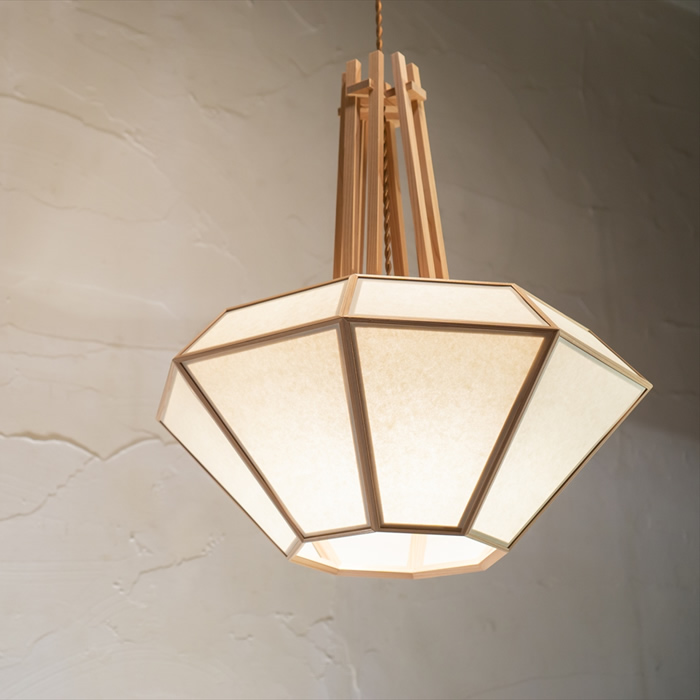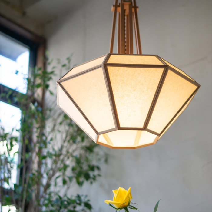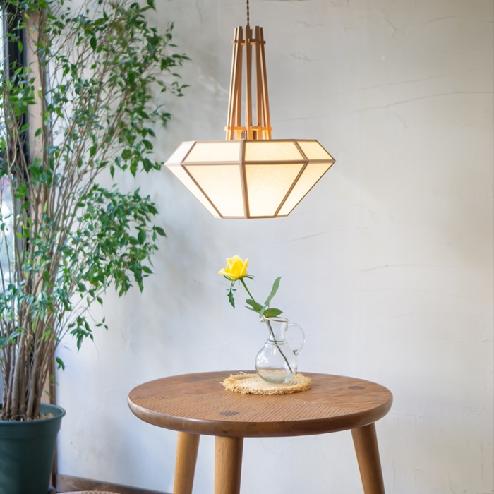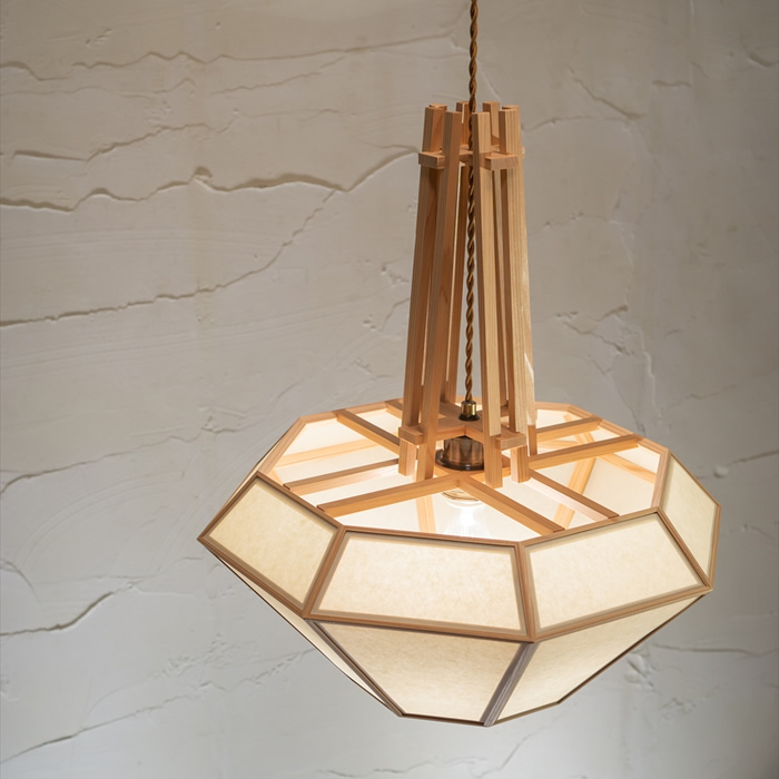 ダイアモンド型のシェード上に立ち上がった「木組み」が特徴のペンダント。