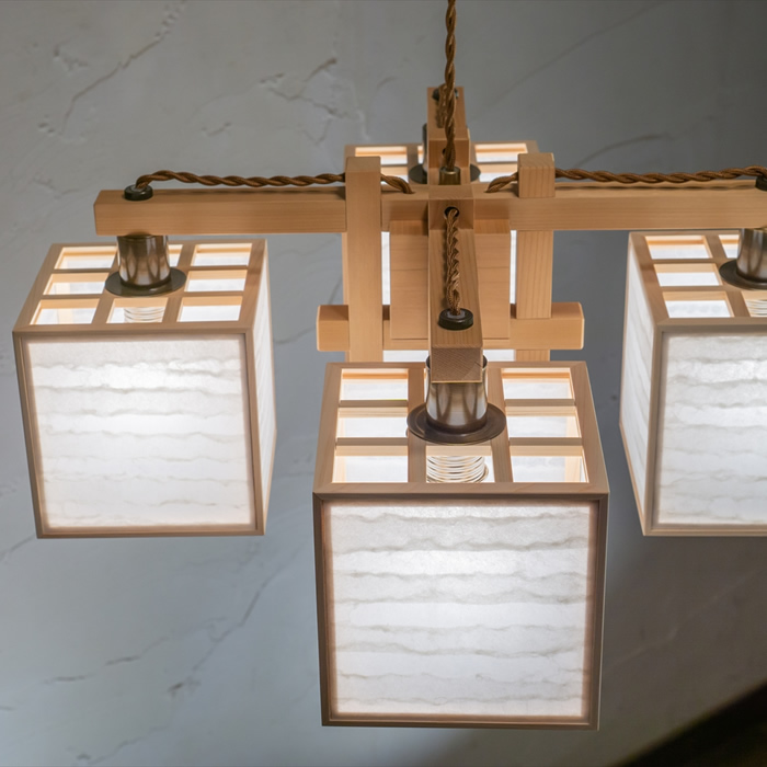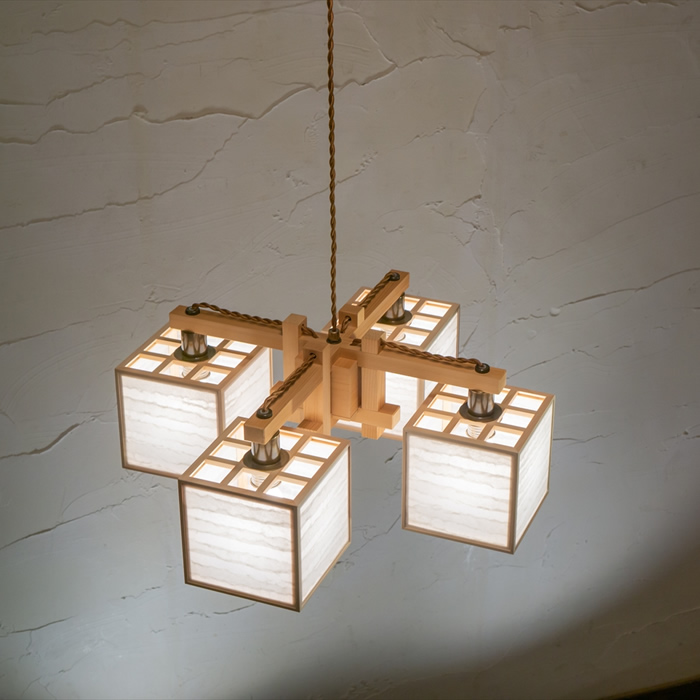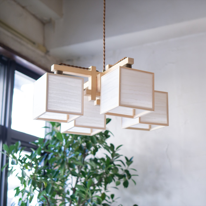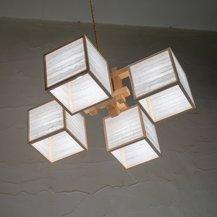 キューブ型のシェードがついた、斬新であたたかみのあるシャンデリア。
