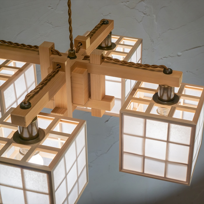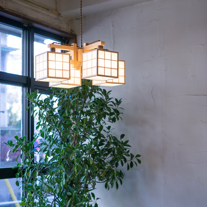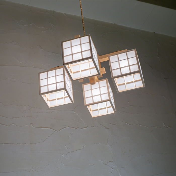 キューブ型のシェードがついた、斬新であたたかみのあるシャンデリア。