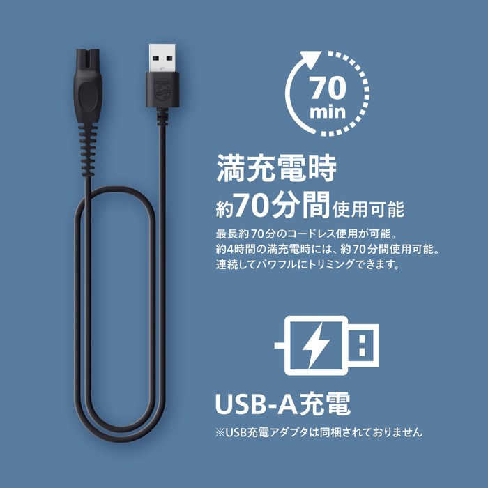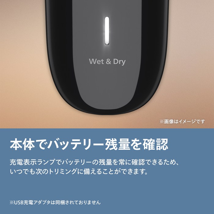 充電表示ランプでバッテリーの残量や充電中の状態を確認できるため、 いつでも次のトリミングに備えることができます。 (USB充電アダプタは同梱されておりません。)