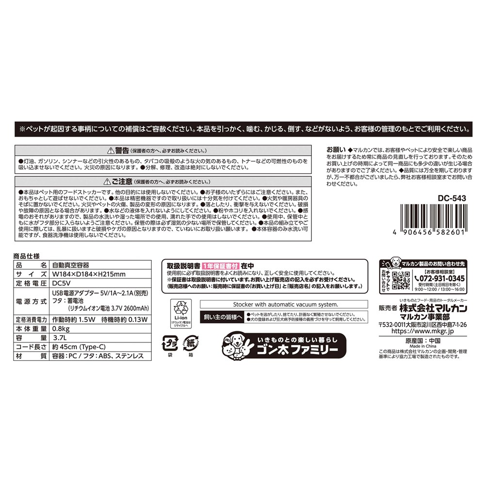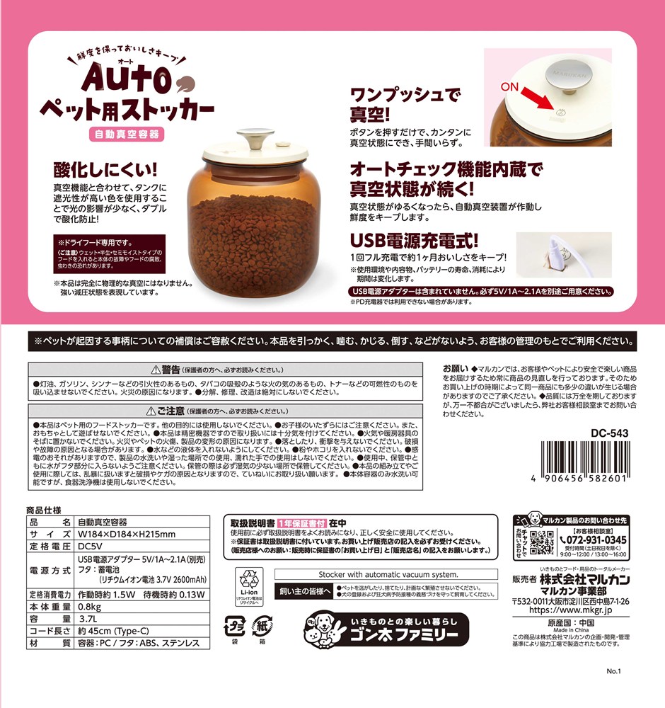 ■電源方式:USB電源アダプター5V/1A~2.1A(別売)、フタ/蓄電池(リチウムイオン電池3.7V 2600mAh)