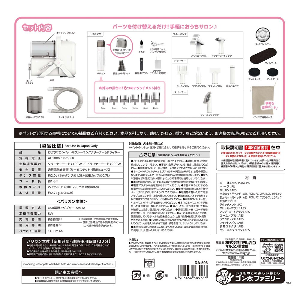 ■セット内容:本体(タンク・ホースコネクタ・拡張カップ・ホース)、バリカン(全身カット用ヘッド、アタッチメント×6個)オイル、USB電源コード、部分カット用ヘッド、掃除用ブラシ、アダプタ、スリッカーブラシ、アンダーコートブラシ、コームノズル、ラウンドノズル、フラットノズル、断熱コネクタ、クリーニングブラシ、ベースフィルター、フィルターA・B・C、パーツ収納用ポーチ