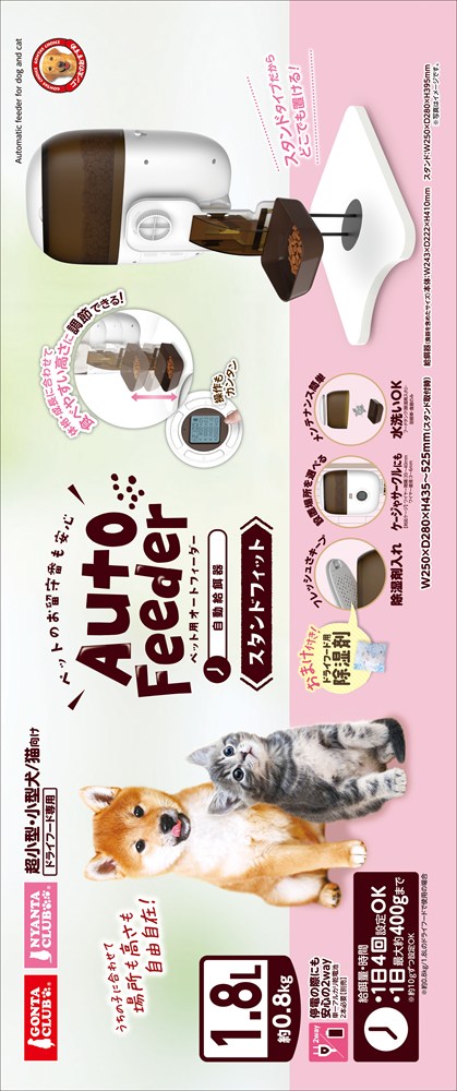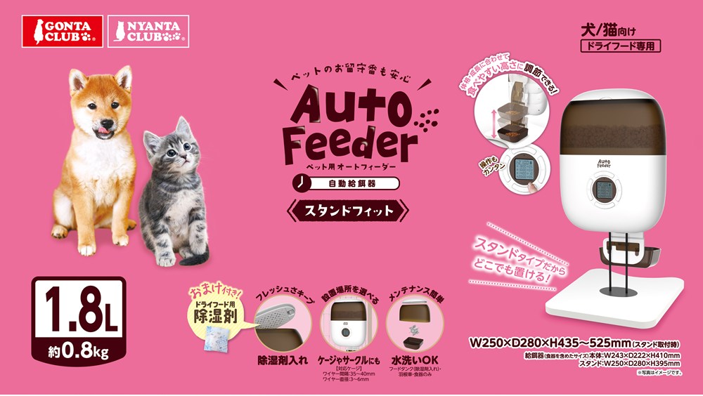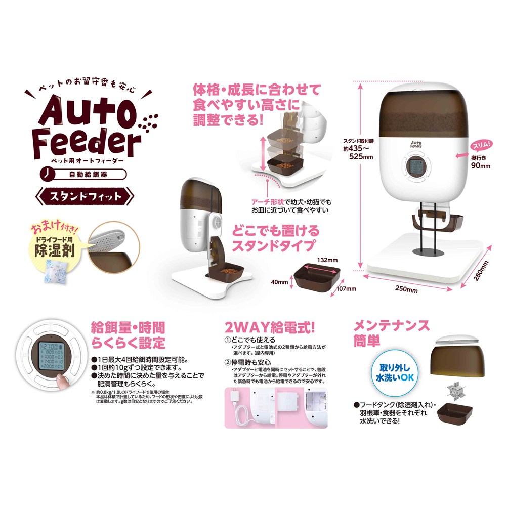 ■本体サイズ:スタンド取付時/W250×D280×H435~525mm、給餌機本体/W243×D222×H410mm(食器を含めたサイズ)、スタンド/W250×D280×H395mm