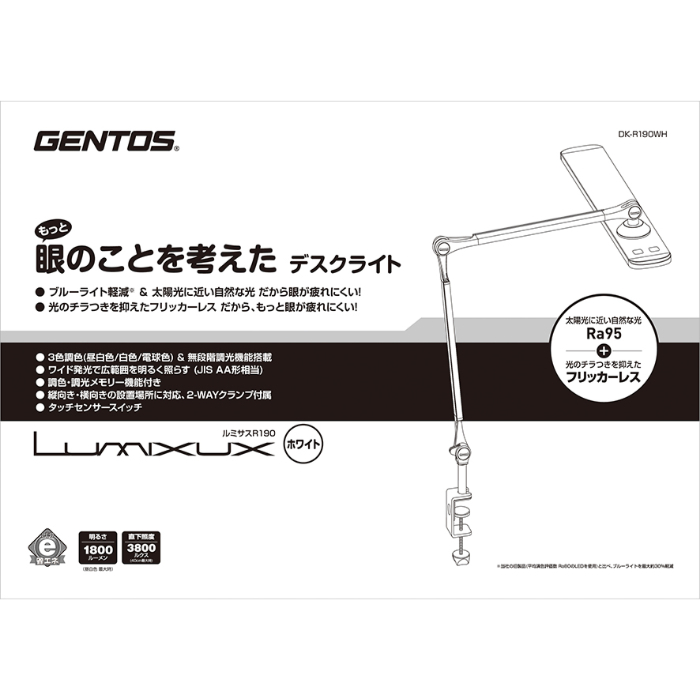 ブルーライト軽減・太陽光に近い光(Ra95)のクランプ式デスクライトです。AC電源を使用。ワイド発光で広範囲を照らします(JIS AA形相当)。