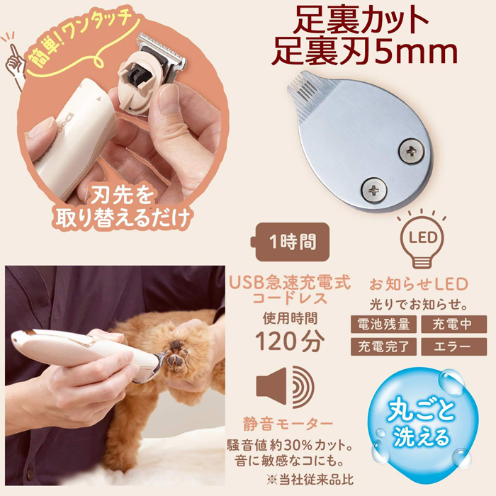 ■約1時間のUSB急速充電式コードレス。使用時間約120分。