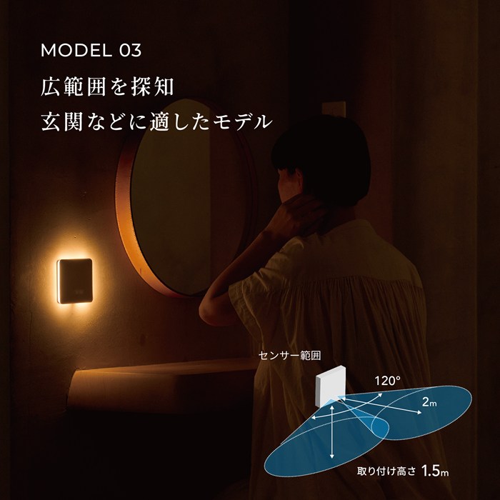 ■センサー:探知方式 焦電型赤外線センサー、探知範囲 最大:壁から水平120°垂直10°最遠2m ※取り付け高さ1.5m時