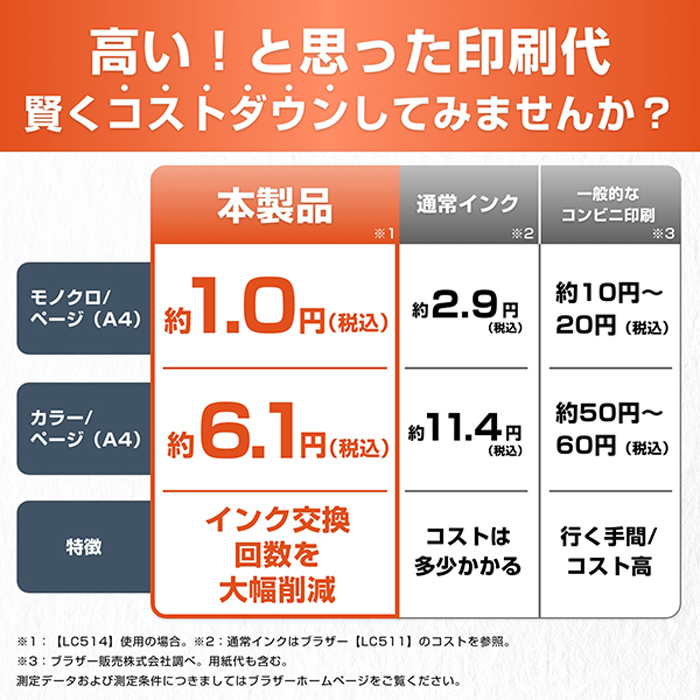 ●ブラザー純正インクは製品本体の性能を十分に発揮するために研究を重ね、開発されています。非純正インクをお使いになりますと製品本体の性能を十分に発揮できないだけでなく製品本体を損傷させる可能性がありますのでご注意ください。