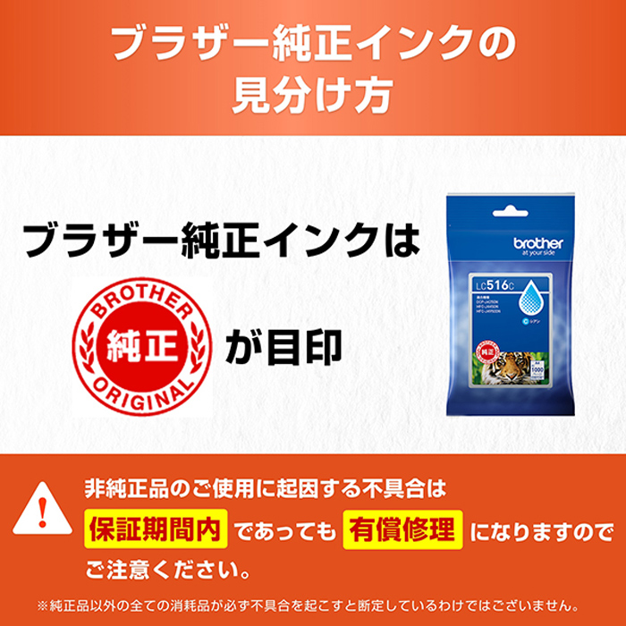 ●ブラザー純正インクは製品本体の性能を十分に発揮するために研究を重ね、開発されています。非純正インクをお使いになりますと製品本体の性能を十分に発揮できないだけでなく製品本体を損傷させる可能性がありますのでご注意ください。