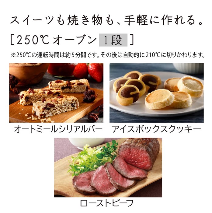 ・オーブン:出力:1,210W/消費電力:1,240W/温度調節:100~210℃・250℃(250℃は短時間出力*5)、発酵(30・35・40・45℃)