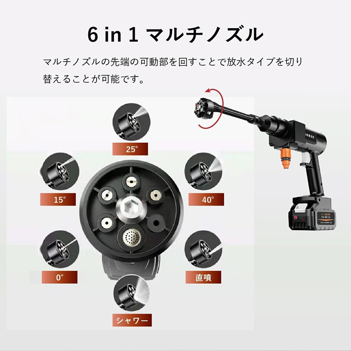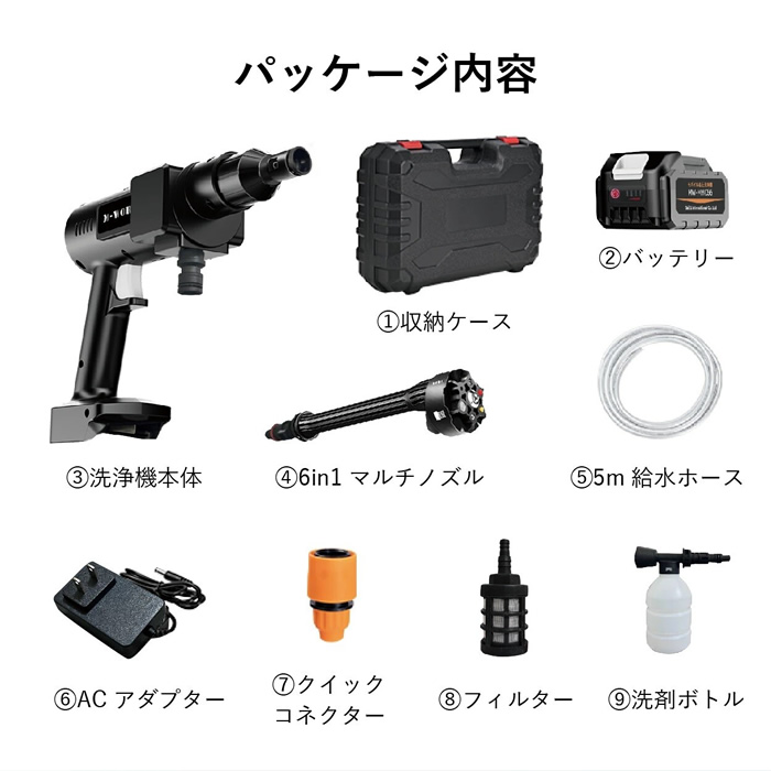 本体/ACアダプター/フィルター/クイックコネクター/バッテリー/洗剤ボトル/給水ホース(5m)/6in1マルチノズル/取扱説明書/収納ケース