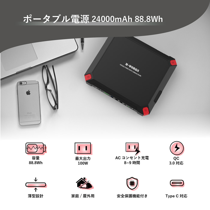 【大容量&高い互換性】24000mAhのバッテリー容量を備えて、キャンプ、車中泊、アウトドアから防災まで幅広くご使用いただけます。