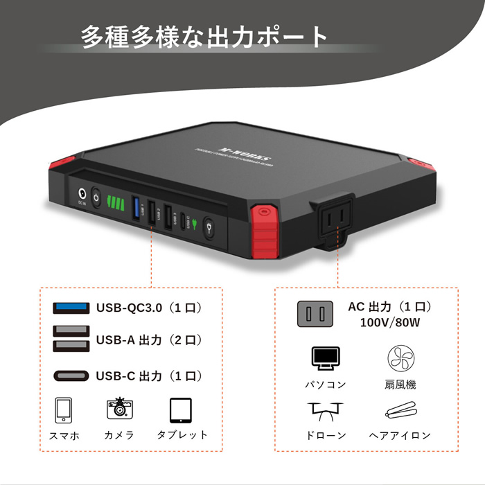 【多種多様な出力ポート】USB-QC3.0(1口)、USB-A出力(2口)、USB-C出力(1口)、AC出力(1口)100V/80Wを搭載。