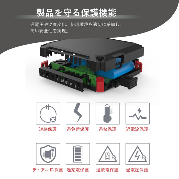 【安全保護機能付き】過電圧や温度変化、使用環境を適切に感知し、高い安全性を実現。