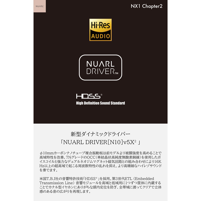 ■「NUARL DRIVER[N10]v5X2」。ダイナミックフルレンジφ10mmカーボンナノチューブ複合振動板と7NグレードのOCC(単結晶状高純度無酸素銅線)ボイスコイル、強力なデュアルネオジムマグネット磁気回路採用。ドライバーは組み込み前に100時間のエージング済み。