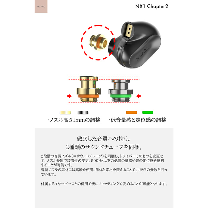 ■2段階の音調ノズル、長短2種類のサウンドチューブ採用。500Hz以下の低音の量感や音の定位感を選択することを実現。