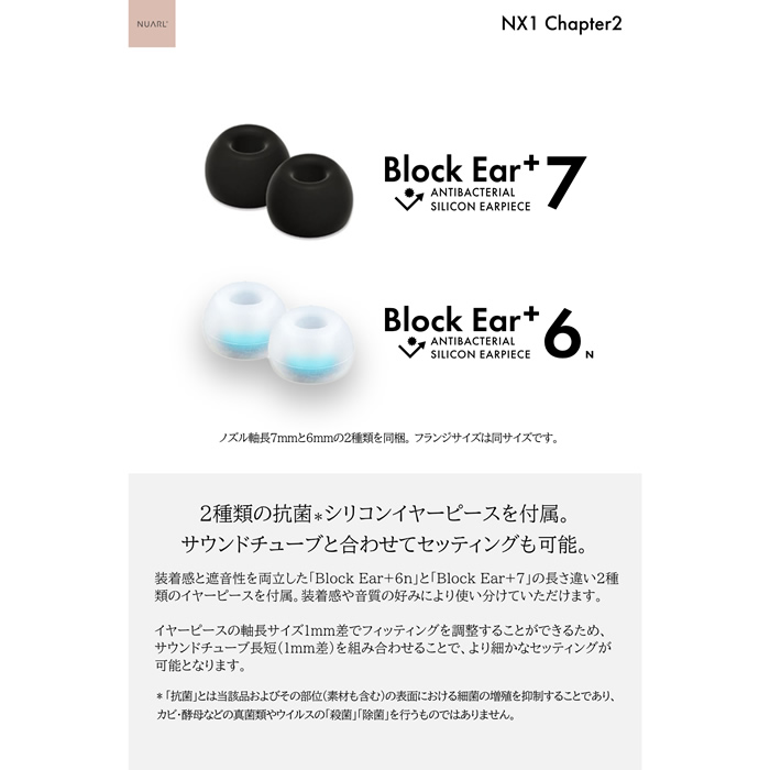 ■φ4.4mmバランス5極プラグ・ステレオイヤホンケーブル、φ3.5mmアンバランス⇔φ4.4バランス変換ケーブル、ケーブルクリップx1、音調ノズル(短2種、長2種 ※各ノズルホルダー付)、Block Ear+7抗菌シリコンイヤーピース(L/ML/MS/S)、Block Ear+6N抗菌シリコンイヤーピース(L/ML/MS/S)、ユーザーズガイド(日本語、英語、中国語)