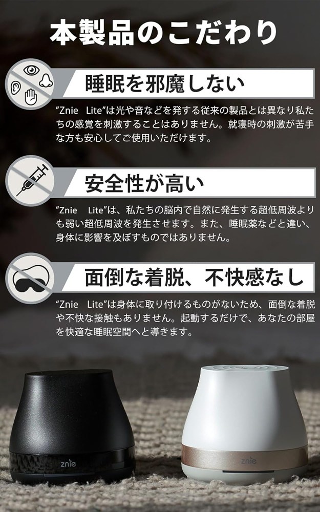 ■『Znie Lite』は、快適な睡眠習慣をサポートするために設計されたスリープテックデバイスです。入眠や眠り続けるのに苦労している人に向けて開発されました。超低周波 (ELF)を生成する『Znie Lite』は、五感を刺激しすぎたり、ライフスタイルを大きく変えたりすることなく、健康的な睡眠スタイルを提案します。