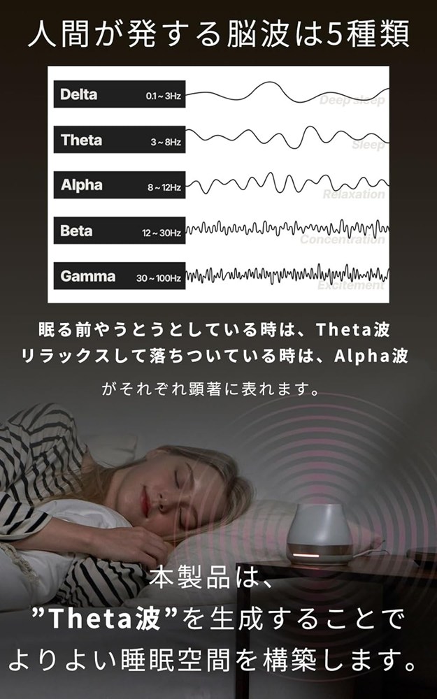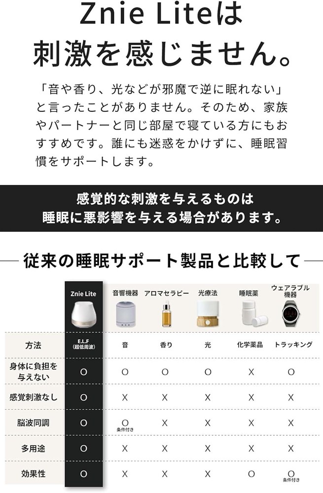 ■『Znie Lite』は他の睡眠サポート製品と比較して、感覚疲労が無いことが大きな特徴です。そのため、家族やパートナーと同じ部屋で寝ている方にもお勧めです。直接脳波に働きかける『Znie Lite』は音や光等を発さないので、誰にも迷惑をかけずに、睡眠習慣をサポートします。