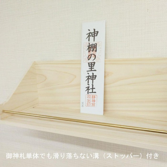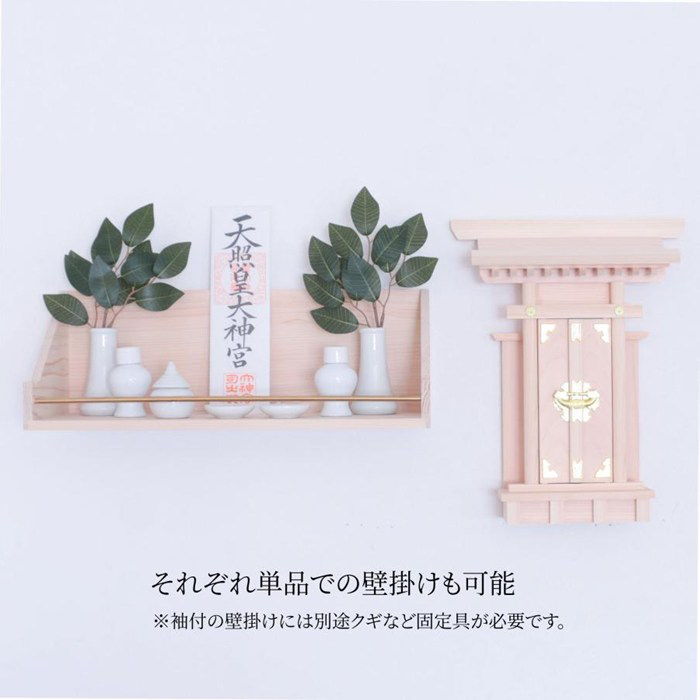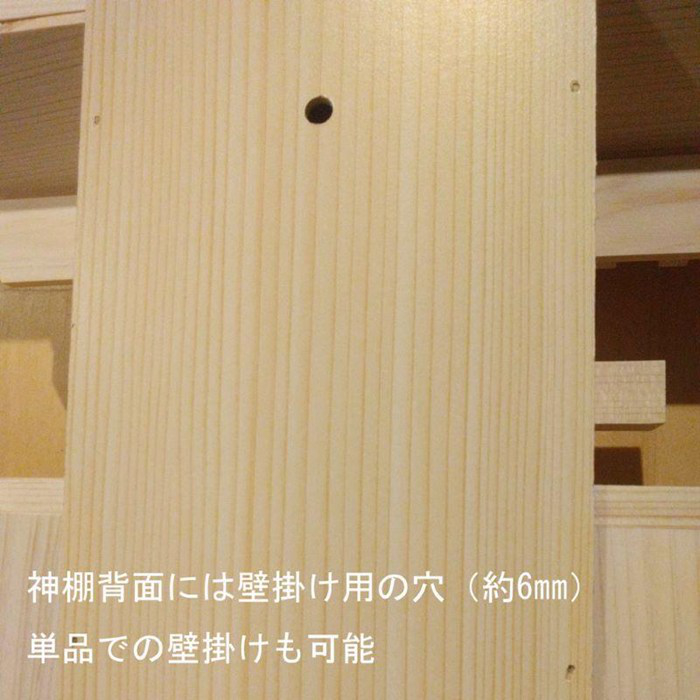 ■神棚本体は小型ですが高さ26センチくらいのお神札まで納められます。背面に6mmほどの穴があいており、別途釘やフックで単独での壁掛けも可能。