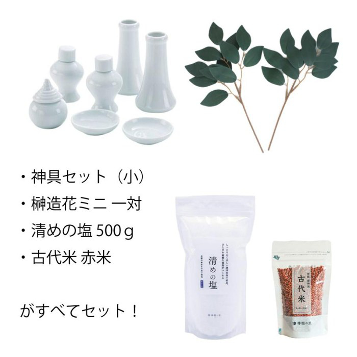 ■セット内容:モダン神棚サクヤ(壁掛け用フック付属)、袖付(神棚本体)、神具セット小、榊造花ミニ、清めの塩500g、赤米