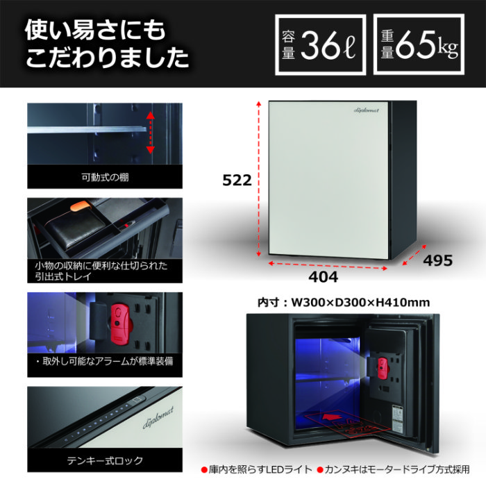 ■付属品:トレイ1,棚板1,緊急解除キー,盗難防止アラーム,説明書,保証書