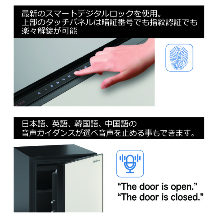 ■セキュリティにも配慮した便利な機能付き。(1)4~16桁までの暗証番号を2種類まで設定可能, 指紋認証は32個の登録が可能 (2)警報アラーム機能 (3)2個の暗証番号を合わせて開錠するデュアルコントロール機能 (4)覗き見による暗証番号解読を防ぐ覗き見防止機能 (5)便利で見易い液晶表示。液晶表示と操作音の有無も選択可能 (6)5回の暗証番号押し間違えで自動ロック作動 (7)緊急時の緊急解除キー (8)日本語,英語,韓国語,中国語の音声ガイダンス付き