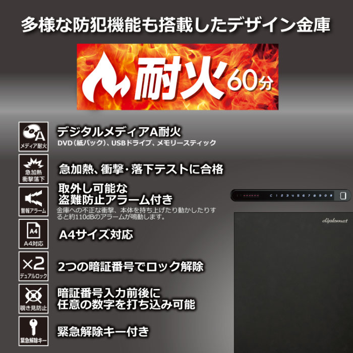 ■60分耐火。急加熱・落下試験合格の強固なボディ。