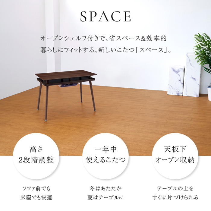 ■継脚付きでこたつの高さを43cm/63cmの2段階に調節可。