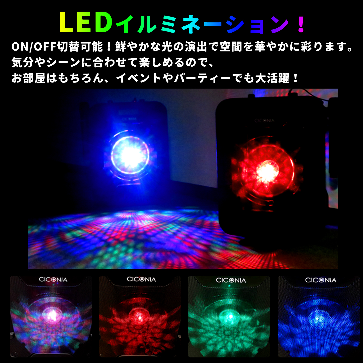 ●スピーカーを鮮やかに彩るLEDライトが、パーティーをさらに盛り上げます。