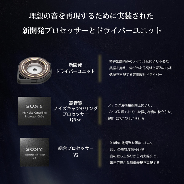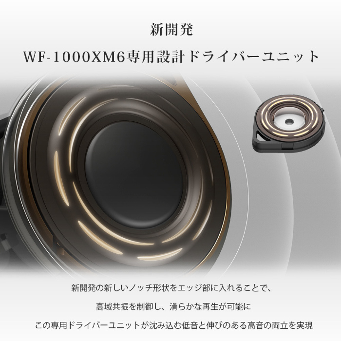 WF-1000XM6ではアーティストが意図する音楽のニュアンスと感動をリスナーに届けるため、音楽制作スタジオのマスタリングエンジニア4名との共創を完全ワイヤレスモデルで初めて実施しました。ジャンルや年代によらず、楽曲が持つ魅力を素直に引き出す低域から高域までバランスの良い音質を実現しています。また特許出願済みの形状を取り入れた専用設計の8.4mmドライバーユニットを採用。さらに新開発の高音質ノイズキャンセリングプロセッサーQN3eと統合プロセッサーV2の2つのプロセッサーによる制御により、音の再現性、解像度が大きく進化しました。