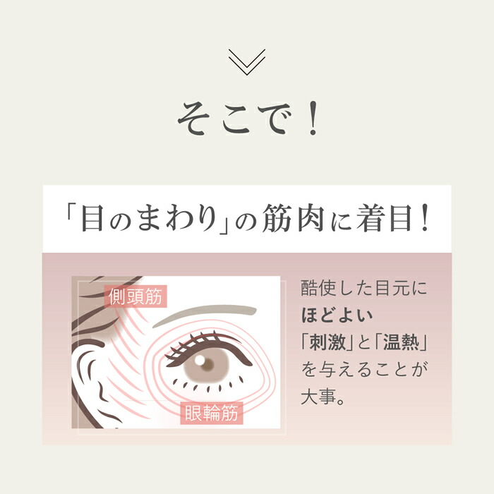まるでホットタオルを当てているかのような温かさ。目元がホッとするような、とろけるような心地よさに緊張が解放され、お休み前のケアなどに最適です。 また局部を温めることで、目元のめぐりをサポートする温活メリットも。約38℃でじんわり温める「低温モード」と約42℃でしっかり温める「高温モード」の2段階を搭載し、 リフレッシュや集中ケアなど目的に合わせて設定できます。