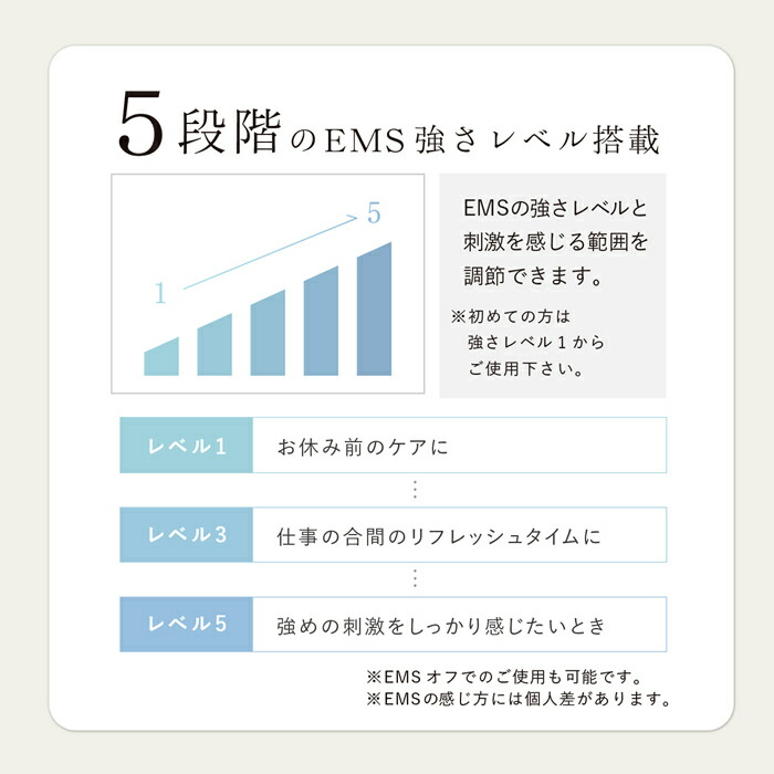 EMSを伝える電極パッドを内側の下部に幅広く設置。目の下にEMSを与えることで、目のまわり全体に刺激を伝え、心身ともにリフレッシュ感を味わうことができます。 5段階の強度レベルで調整が可能で、ご使用シーンやその日の気分、お体の調子によってお好みでお選びいただけます。