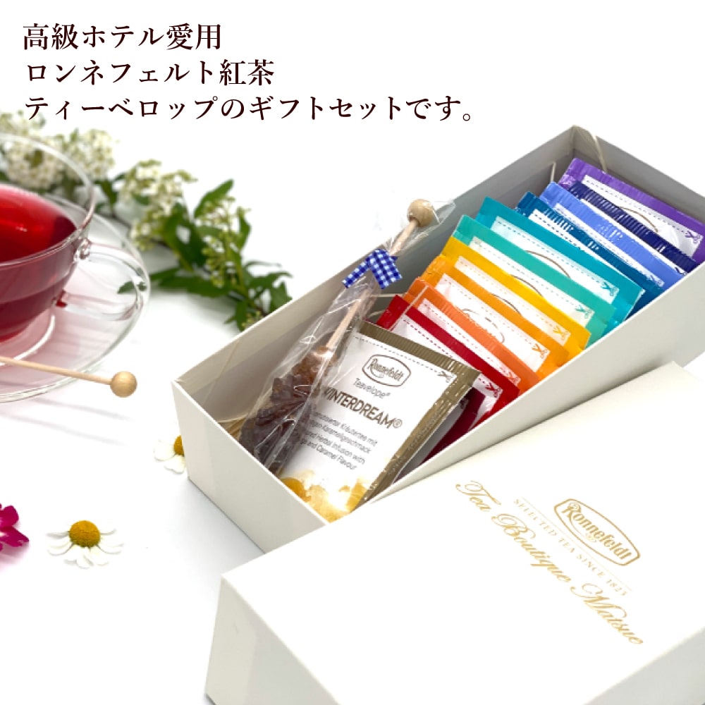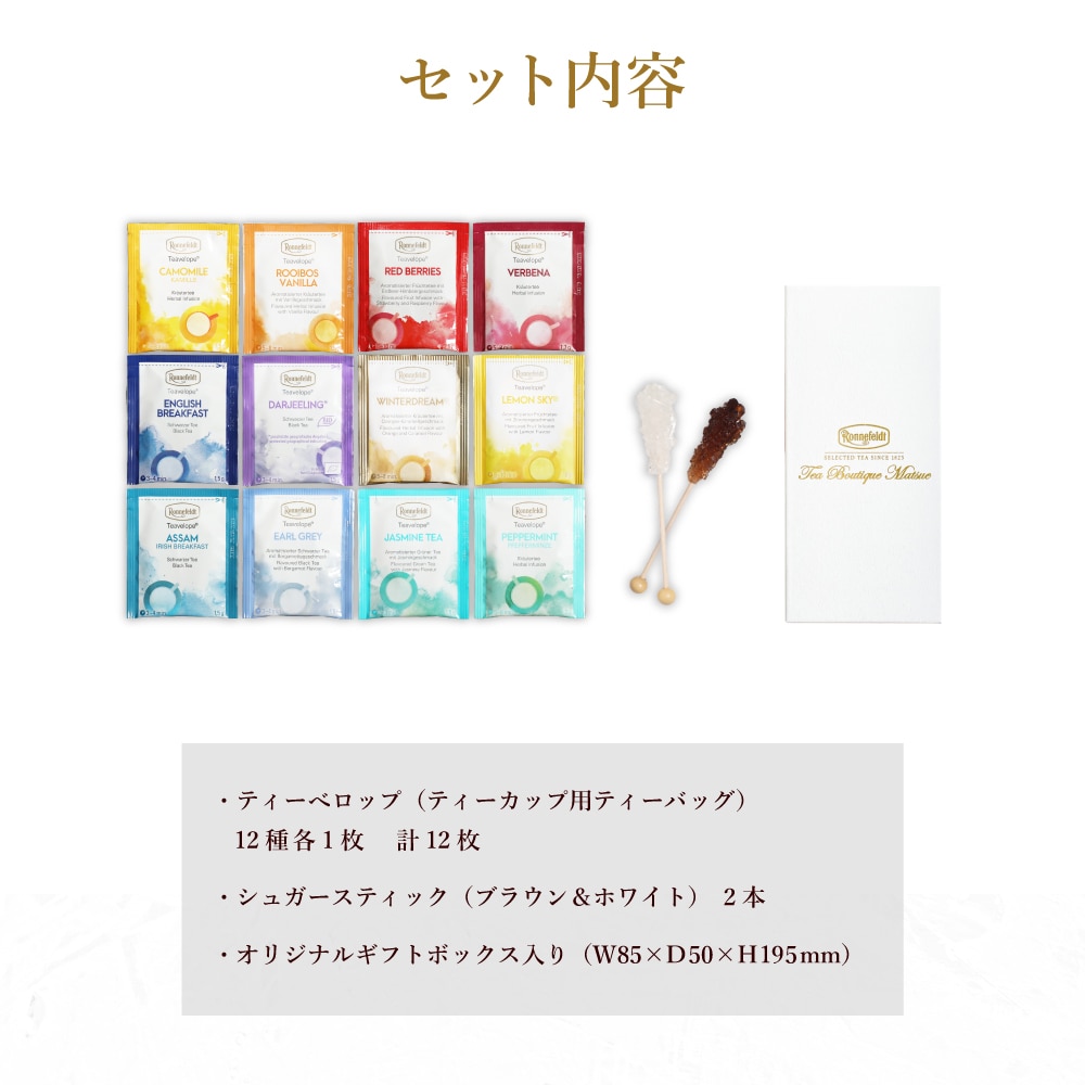 つり下げタイプのティーバッグ【ティーベロップ】が全12種類各1袋ずつと、シュガースティック2本が入ったギフトセットです。 12種類ものティーが楽しめるので、プレゼントに最適です☆ 紅茶、緑茶、ルイボスティー、ハーブティーと、様々な種類のティーが入っていますので、飽きることなく 楽しみながら選んでお飲みいただけます。 味はもちろん、カラフルで可愛いティーバッグのパッケージも大人気で 受け取られた方のテンションを上げてくれること間違いなしのギフトです♪
