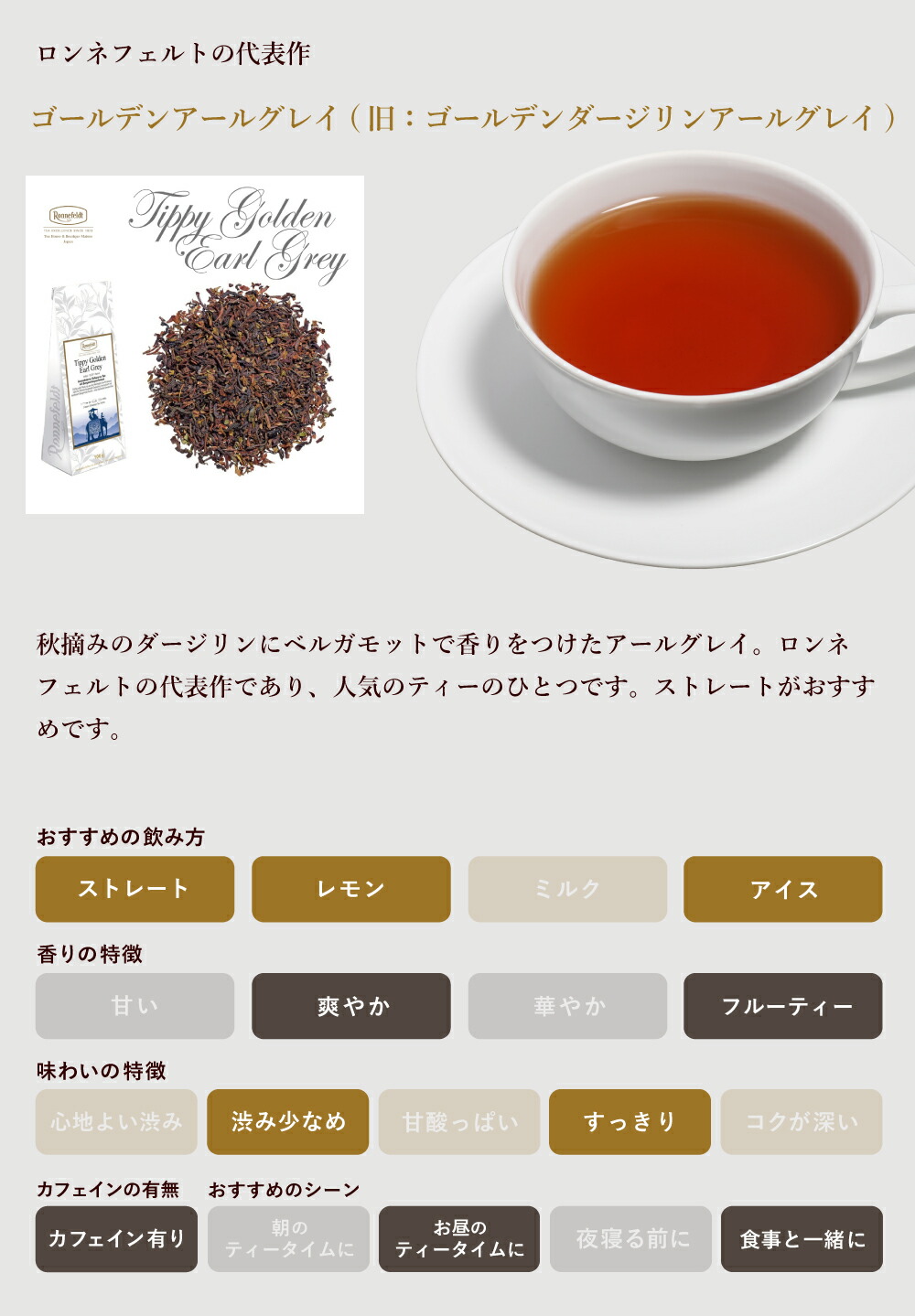 最高級の秋摘みのダージリンにベルガモットの香りをブレンドしたロンネフェルトの代表的なティーのひとつ。ダージリンの上品な味わいとベルガモットの爽やかな香りが絶妙です。