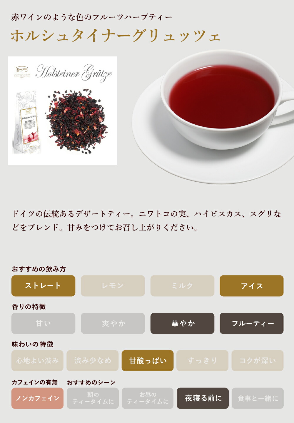 ドイツの伝統あるデザートティー。茶葉を一切使わず、ドライフルーツのみで出来た少し変わったティーです。甘酸っぱいフルーツの味が口一杯に広がります。水色も真紅色なので見た目もとてもキレイです。少し濃いめにアイスティーを作った後、炭酸水、シャンパンなどで割っても楽しめるオシャレなティーです。