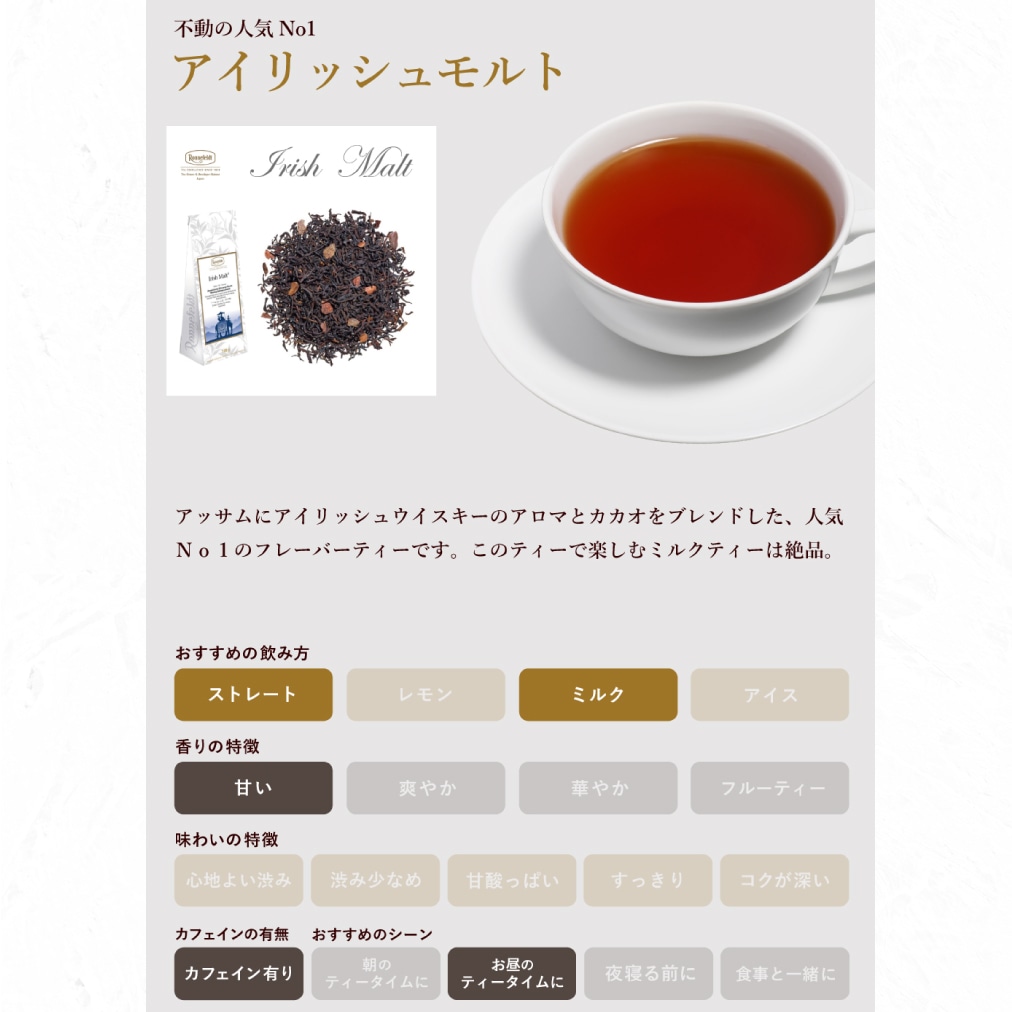 数あるロンネフェルトのティーの中で、一番人気、ロングセラーなのがこの紅茶「アイリッシュモルト」。ミルクティーによく合うアッサムに芳醇なアイリッシュウイスキーのアロマとカカオの実をブレンドした、甘い甘い香りのティーです。 アイリッシュモルトで作るロイヤルミルクティーは一度飲んだらやみつきに。プレゼントにも大変喜ばれます。