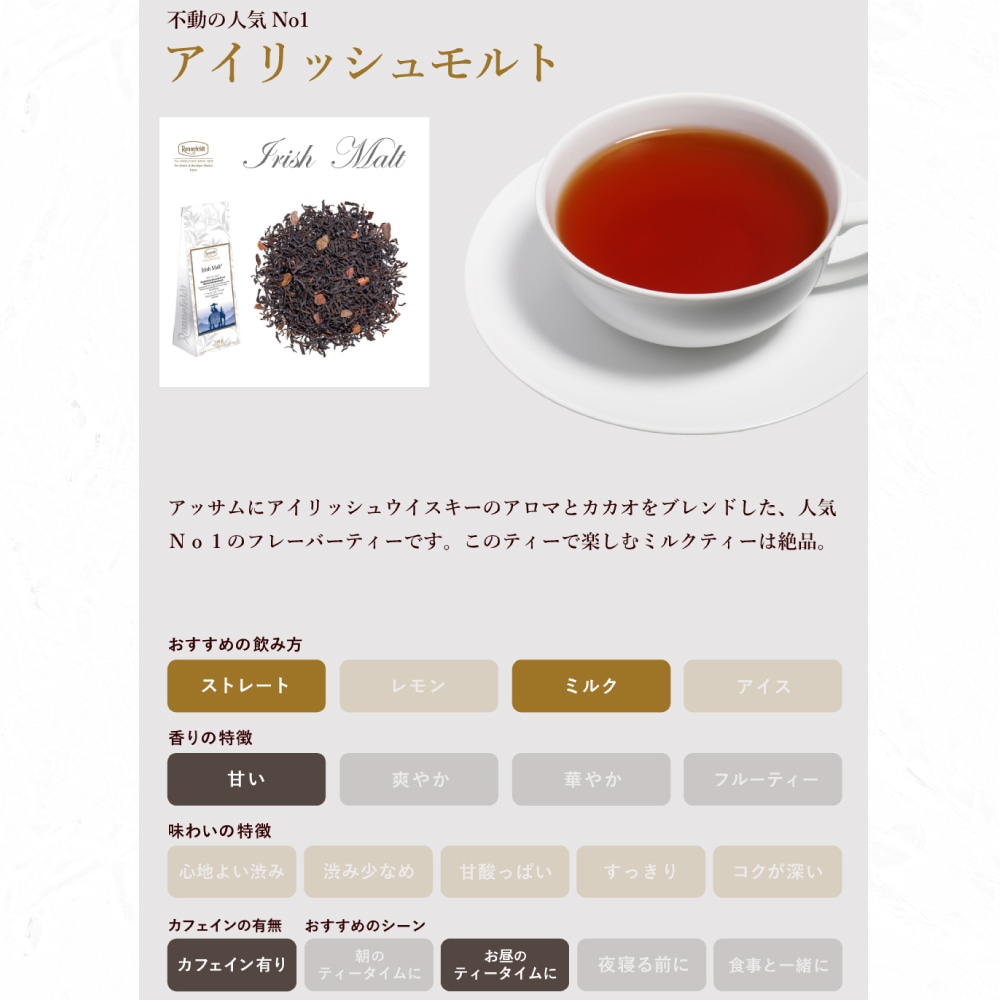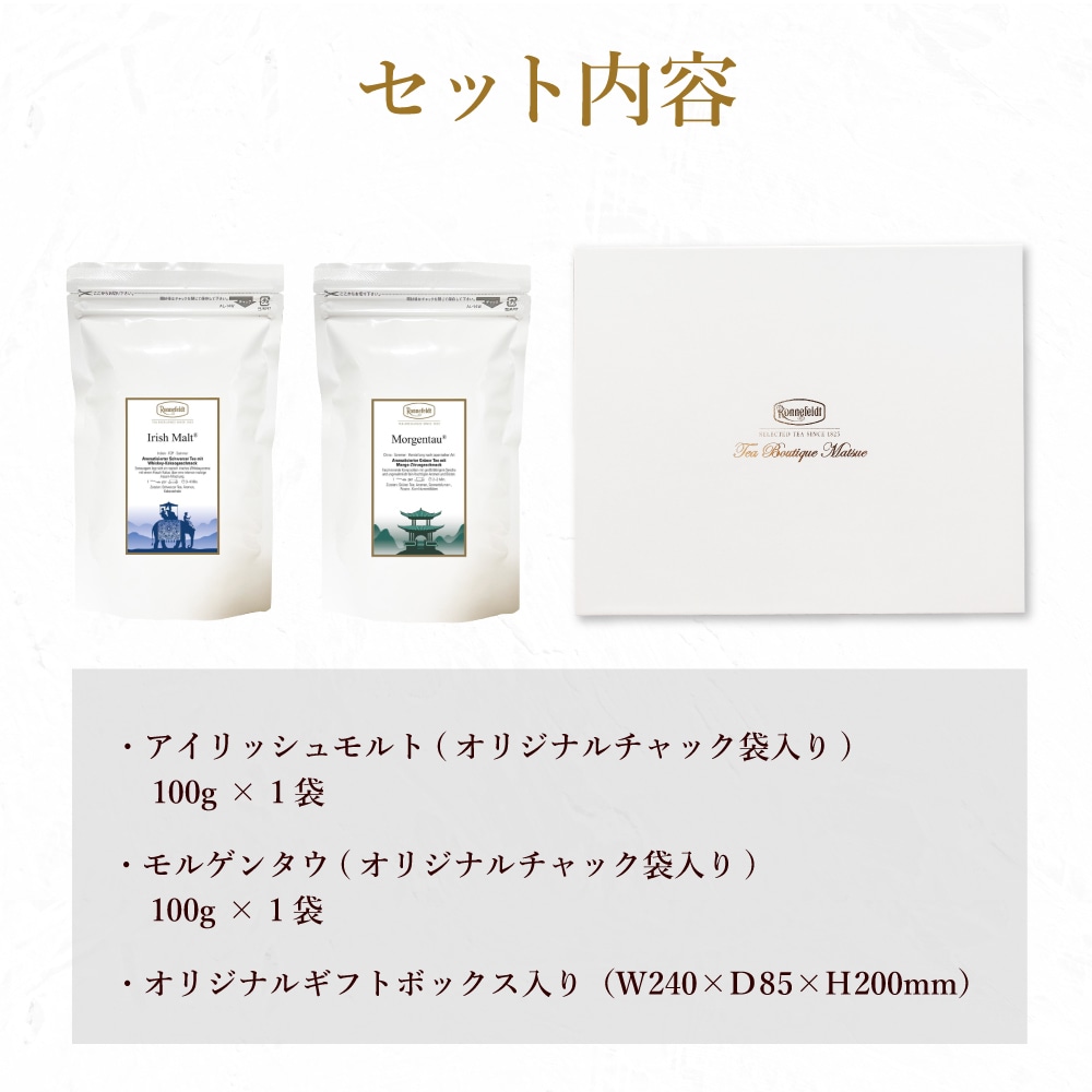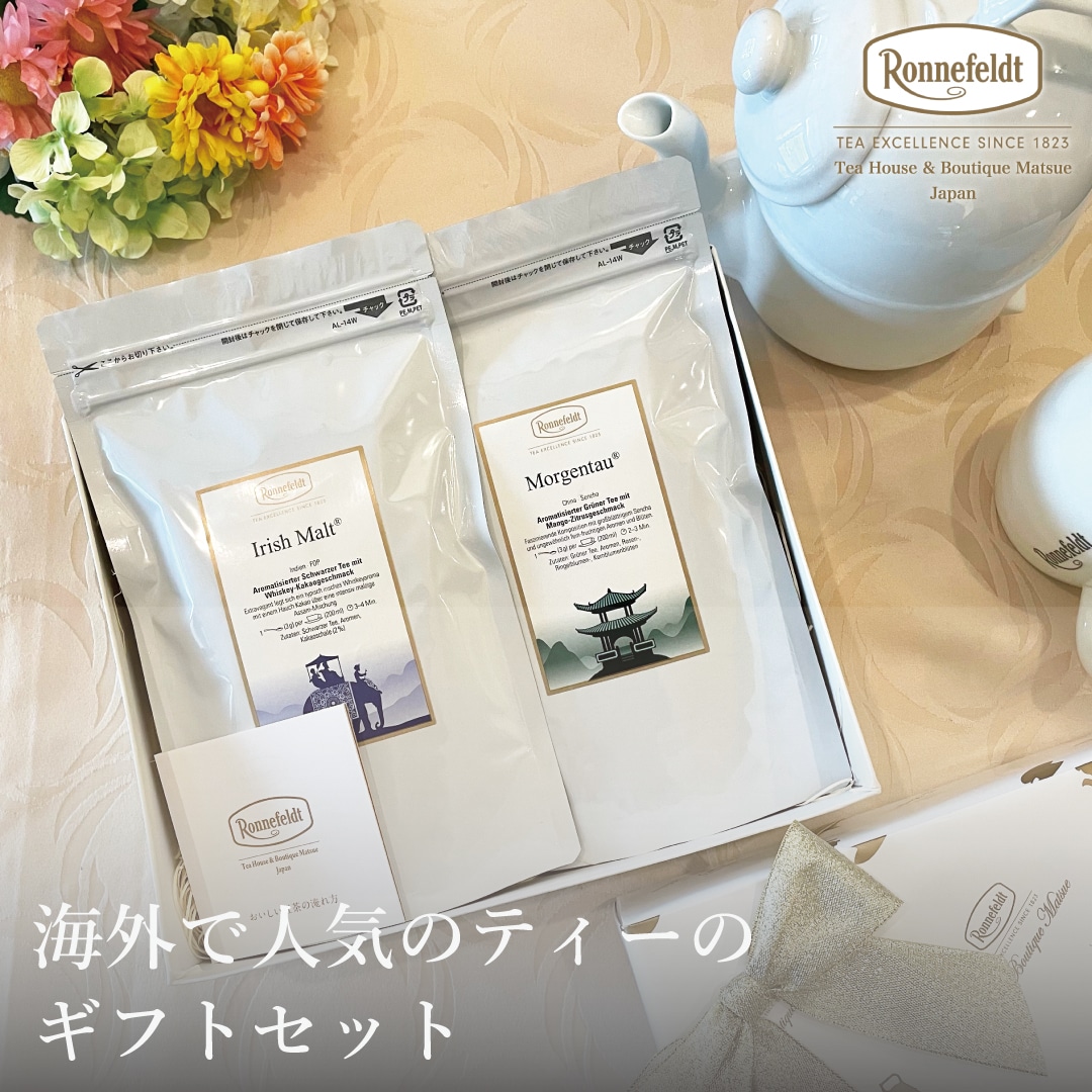 海外で人気No.1のモルゲンタウと、日本でも大人気アイリッシュモルトのギフトセット。 緑茶にマンゴーとバラの香りをブレンドしたモルゲンタウは、ドイツをはじめ海外で大人気のティーです。 ベースが緑茶ですので和菓子にもよく合い、またアイスティー、水出しにしても美味しくお飲みいただけます。 美味しい紅茶の淹れ方のしおりも入っているので、差し上げた方も安心してお楽しみいただけます。
