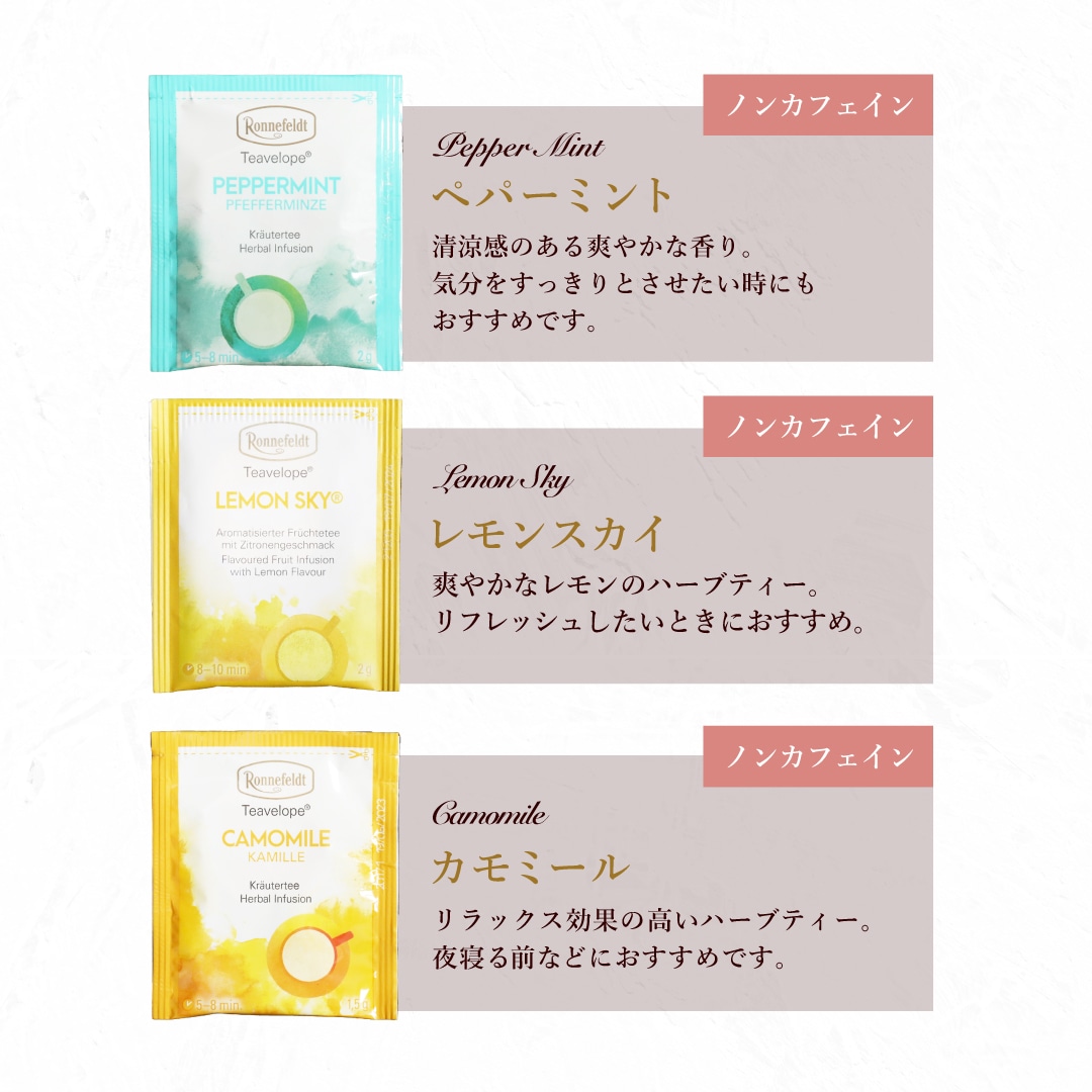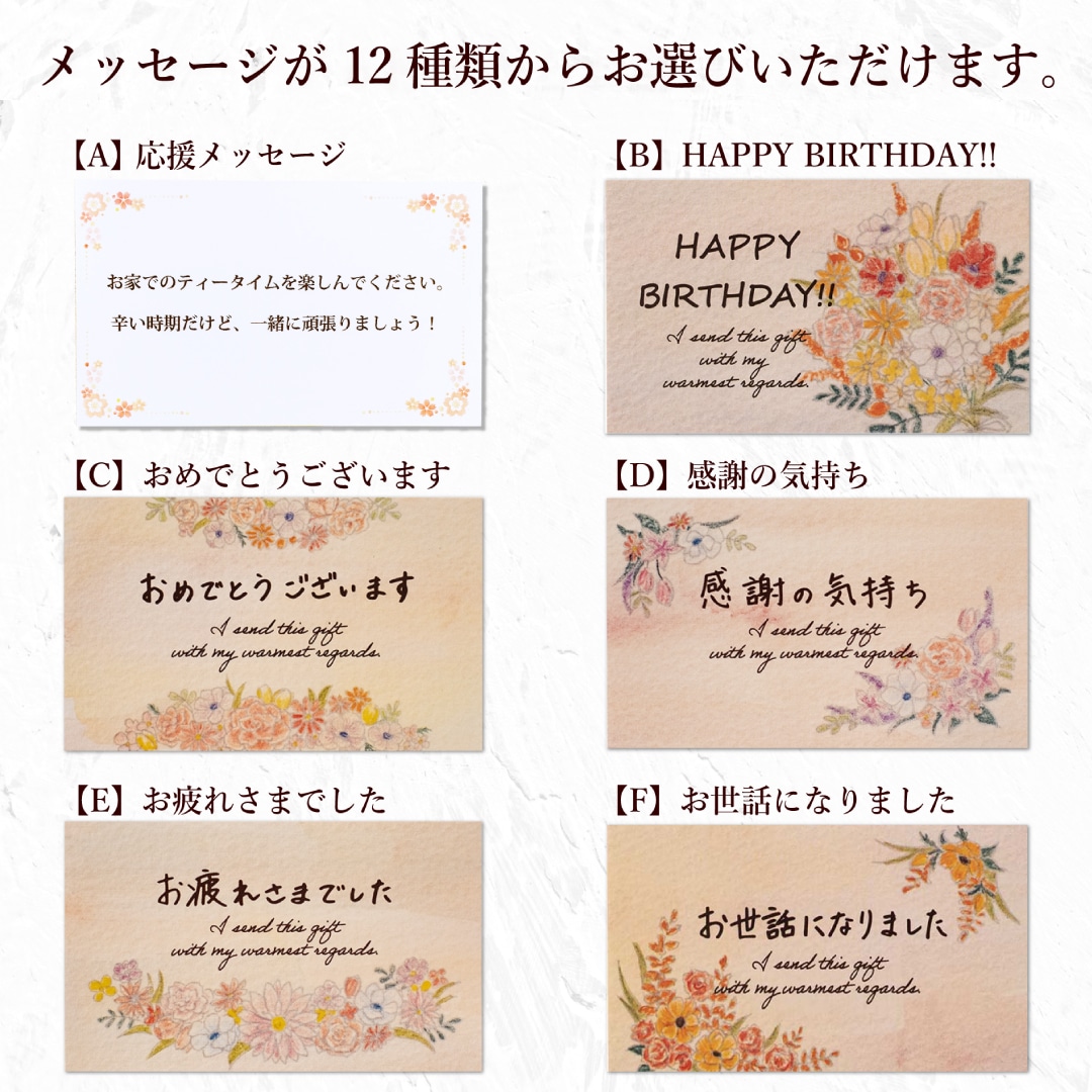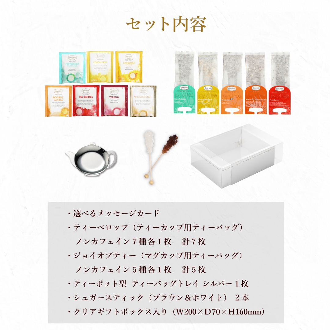 大人気 高級紅茶を楽しむギフトセットにノンカフェインバージョンが登場しました。 ノンカフェインティーバッグに、スティックシュガー、ティーバッグトレーがセットになっていますので、素敵なおうちティータイムをお楽しみいただけるギフトとなっております。 ノンカフェインなので、妊娠中の妊婦さん・授乳中の方への贈り物や、お子様のおられるご家庭への贈り物にもおすすめです! また、メッセージカードが12種類からお選びいただけます。 ハッピーバースデーはもちろん、感謝や祝福の言葉、シーズンイベントのカードもありますので、ご用途に合わせてお使いください。 喜ばれること間違いなしのノンカフェイン紅茶ギフトセットです。 ※こちらの商品には、のし紙をお付けすることは出来ません。備考欄でのし紙をご希望された場合も、のし紙なしでのお届けとなりますのでご注意ください。