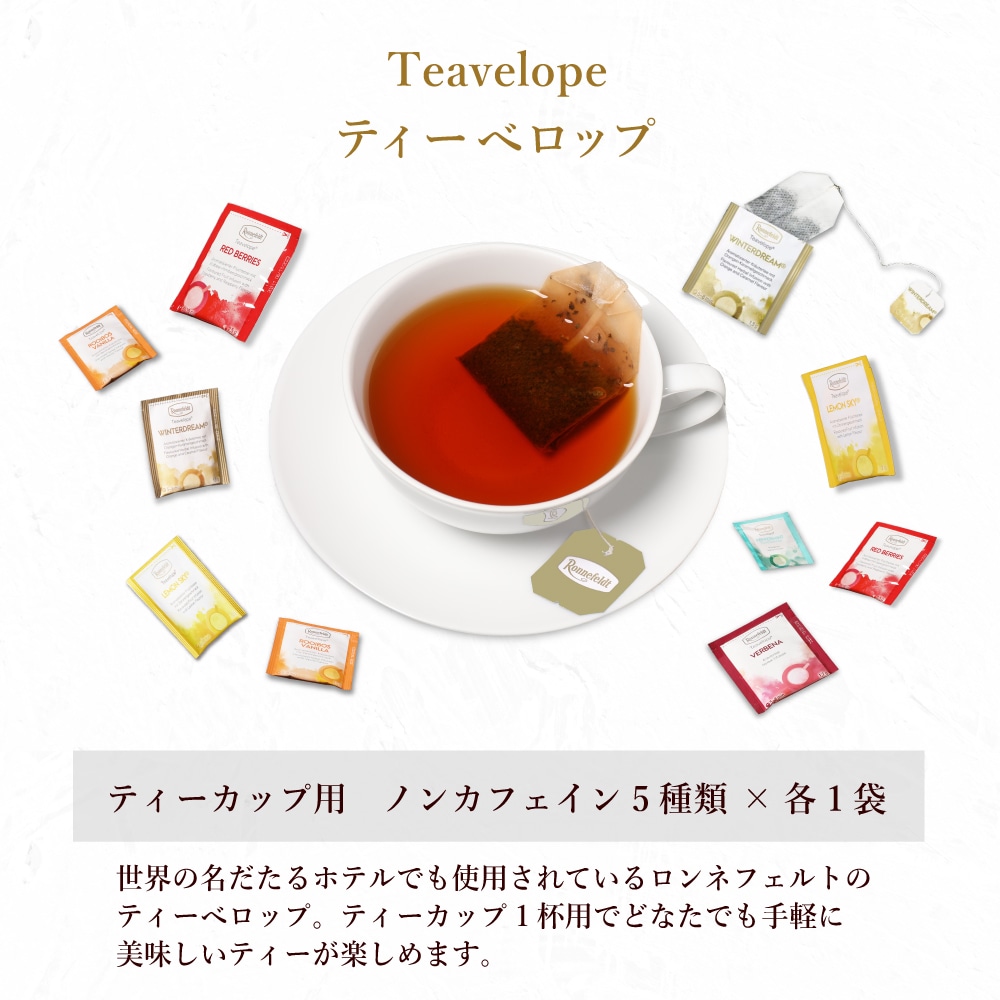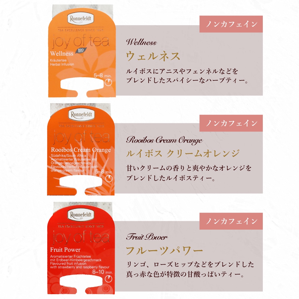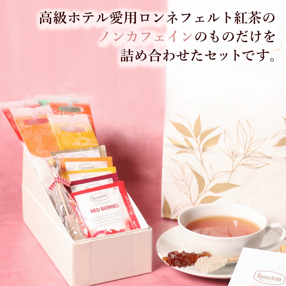 世界の高級ホテルに愛用されるロンネフェルト紅茶。 ロンネフェルトのノンカフェインのティーバッグ10種が1袋ずつと、シュガースティックが入ったギフトセットです。 ハーブティー、ルイボスティー、フルーツハーブティーと、様々な種類のノンカフェインのティーが入っておりますので、飽きることなく 毎日楽しみながら選んでお飲みいただけます。 ノンカフェインですので、妊娠中の妊婦さん・授乳中の方への贈り物や、お子様のおられるご家庭への贈り物にも、おすすめのノンカフェイン紅茶ギフトセットです。 ノンカフェインという事が一目で分かるしおりと美味しい紅茶の淹れ方のしおりがついていますので、贈り先の方も、安心して美味しく楽しく紅茶を飲んでいただけます。