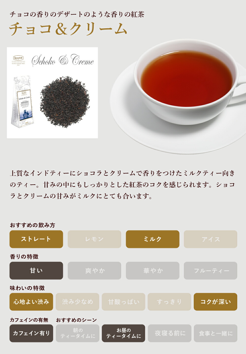 上質なインドティーにショコラとクリームで香りをつけたミルクティー向きのティー。甘みの中にもしっかりとした紅茶のコクを感じられます。