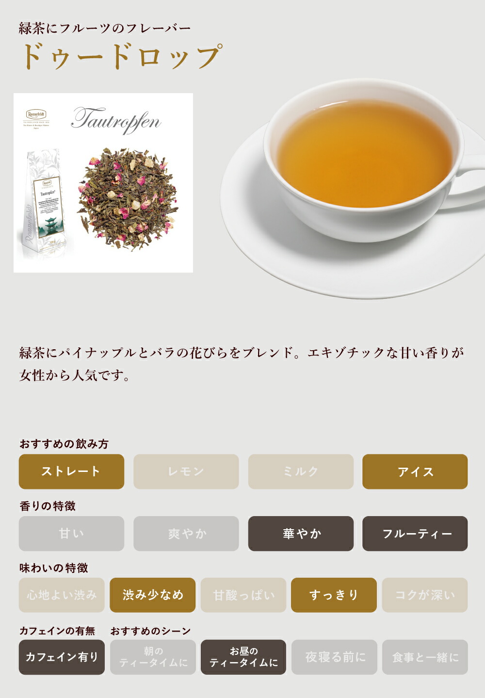 モルゲンタオ同様、中国緑茶をベースに使い、パイナップルとバラの花びら、ベニバナをブレンド。緑茶なのに西洋風な味わいのあるお茶です。ドゥードロップとは「玉の露」という意味があります。女性の方から支持のあるティーとなっております。