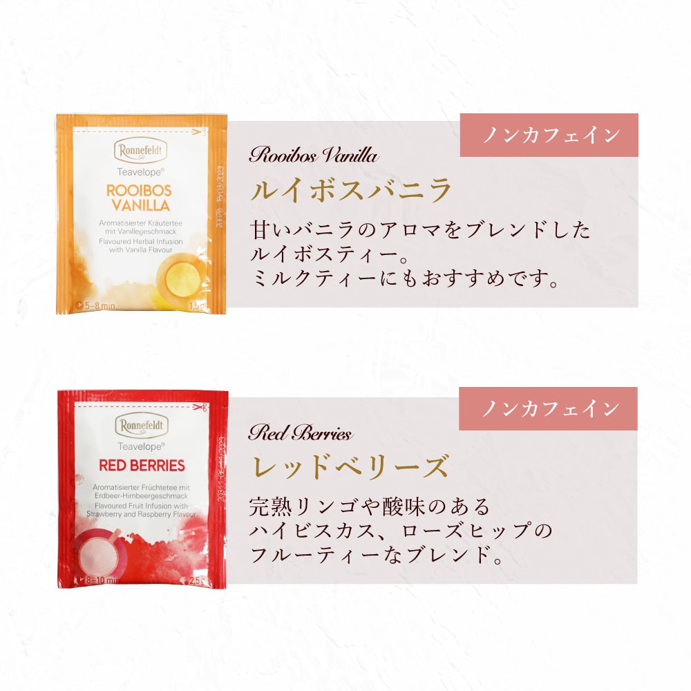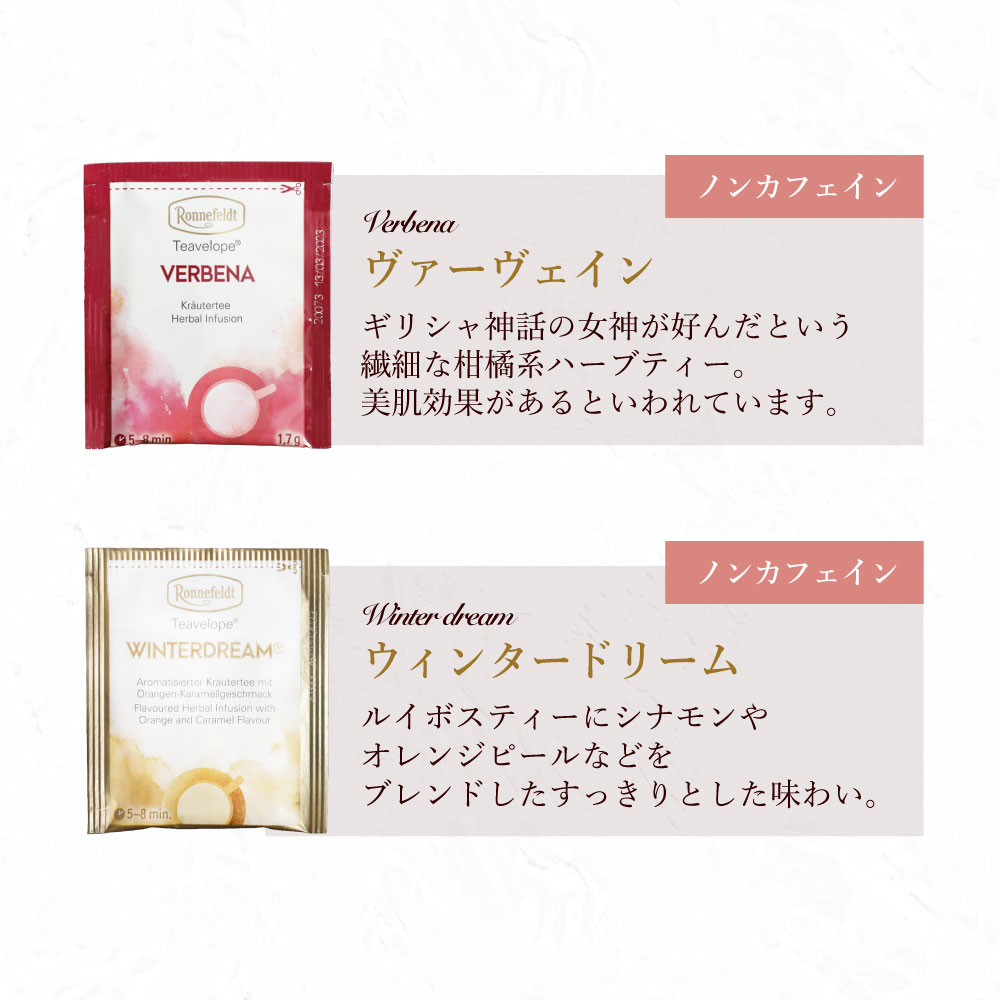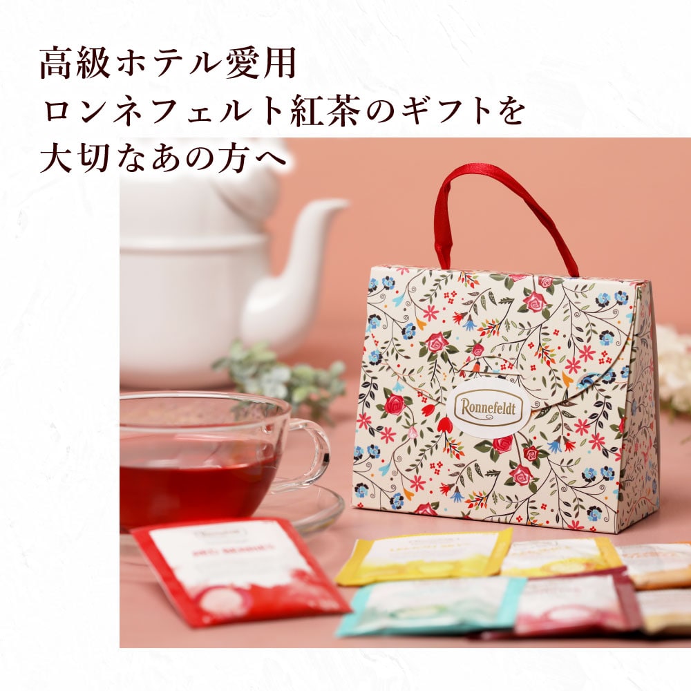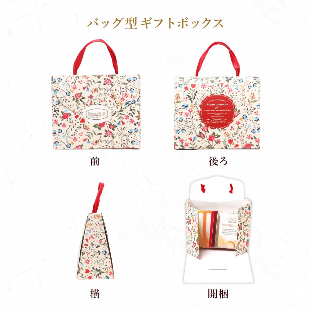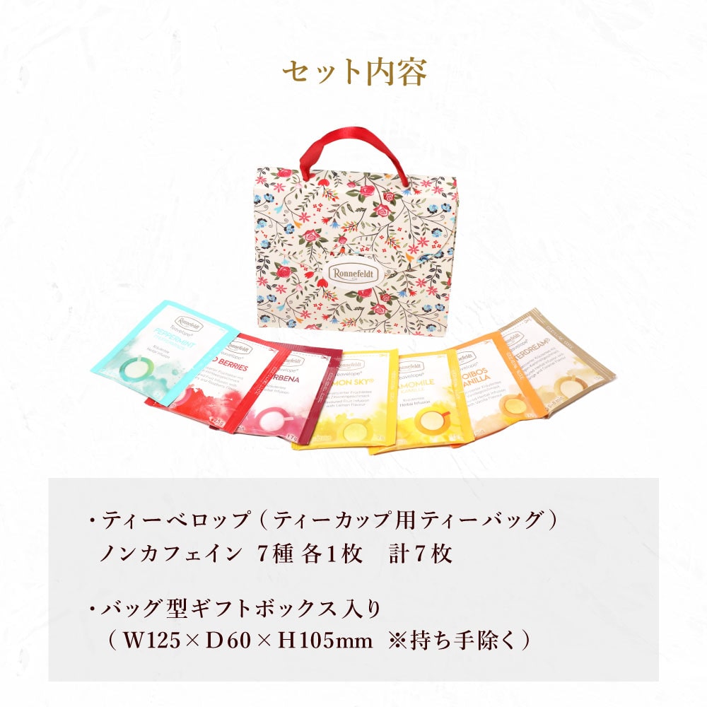 可愛らしい花柄のバッグの形の箱に入ったノンカフェインティーバッグのギフトセットです。 中にはロンネフェルトのティーバッグ「ティーベロップ」のノンカフェインのもの7種類が1袋ずつ入っています。 プチサイズのバッグ型ギフトは、ちょっとした贈り物にぴったり! ホワイトデーのお返しに、お礼に、お土産に…、いろいろなシチュエーションに最適です。 もちろん、ノンカフェインの紅茶のセットなので、妊婦さんへのプレゼントとしても。 ロンネフェルトティーブティック松江オリジナルのブランドロゴの入った白いビニールの手提げ袋を、ご注文個数分お付けいたします。 こちらの商品は、写真のこの形がラッピング完成の状態になります。備考欄でラッピングをご希望された場合も、この形以上のラッピングは出来ませんのでご了承ください。 ※こちらの商品には、のし紙をお付けすることは出来ません。備考欄でのし紙をご希望された場合も、のし紙なしでのお届けとなりますのでご注意ください。