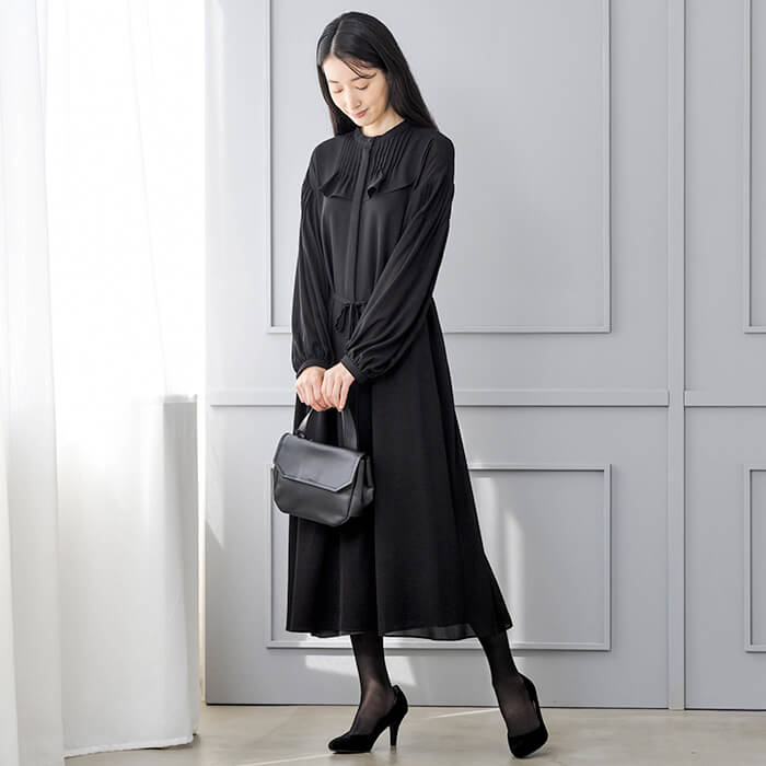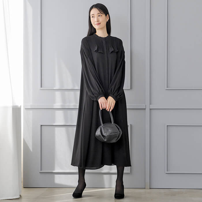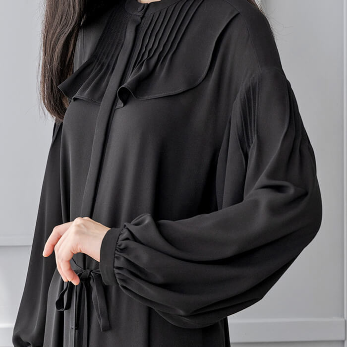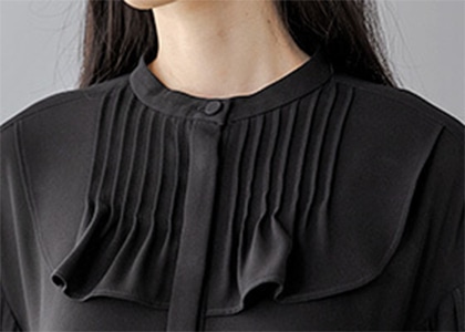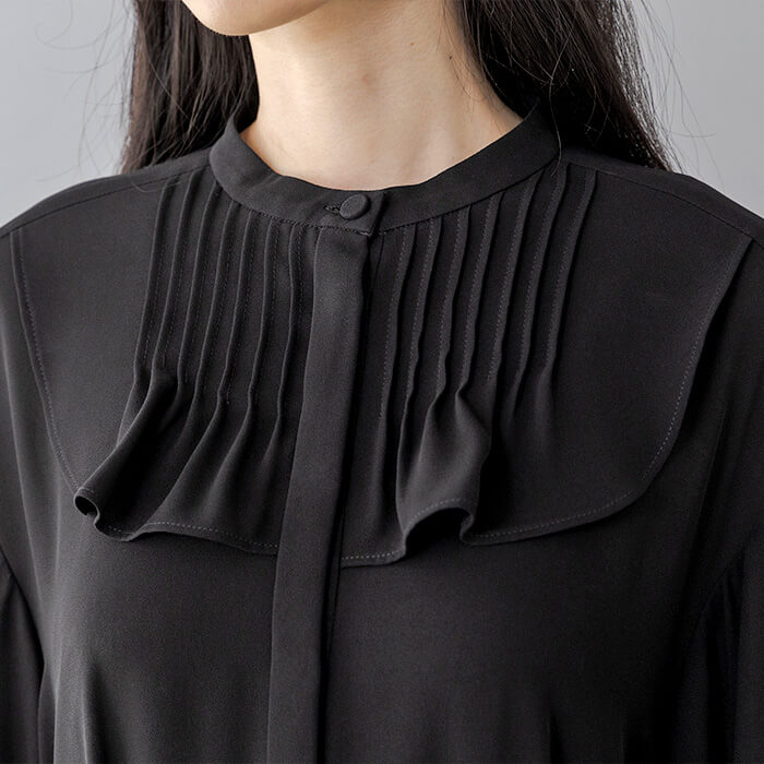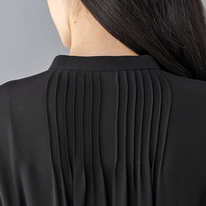 フロントのピンタックがポイント。フェミニンな雰囲気に。