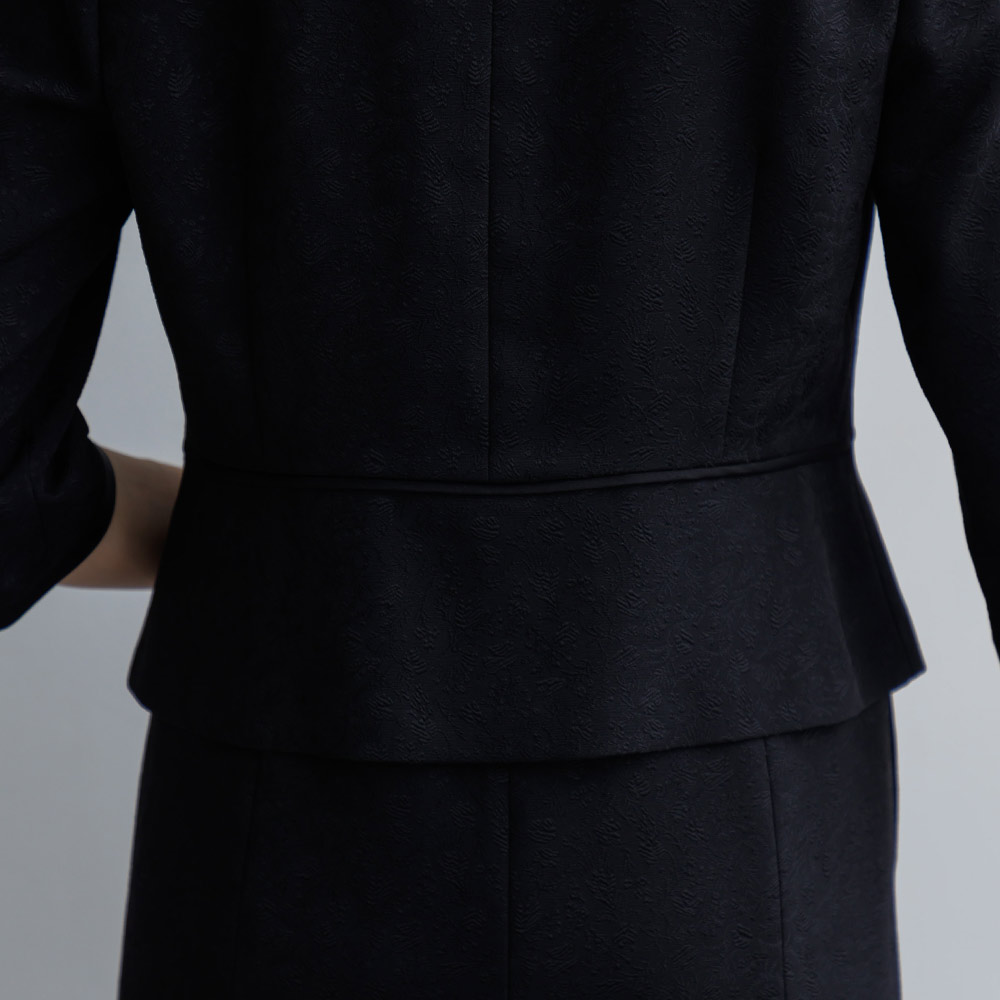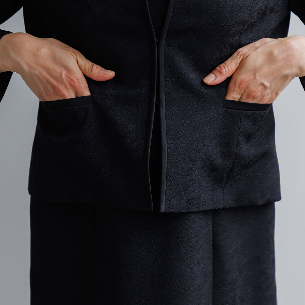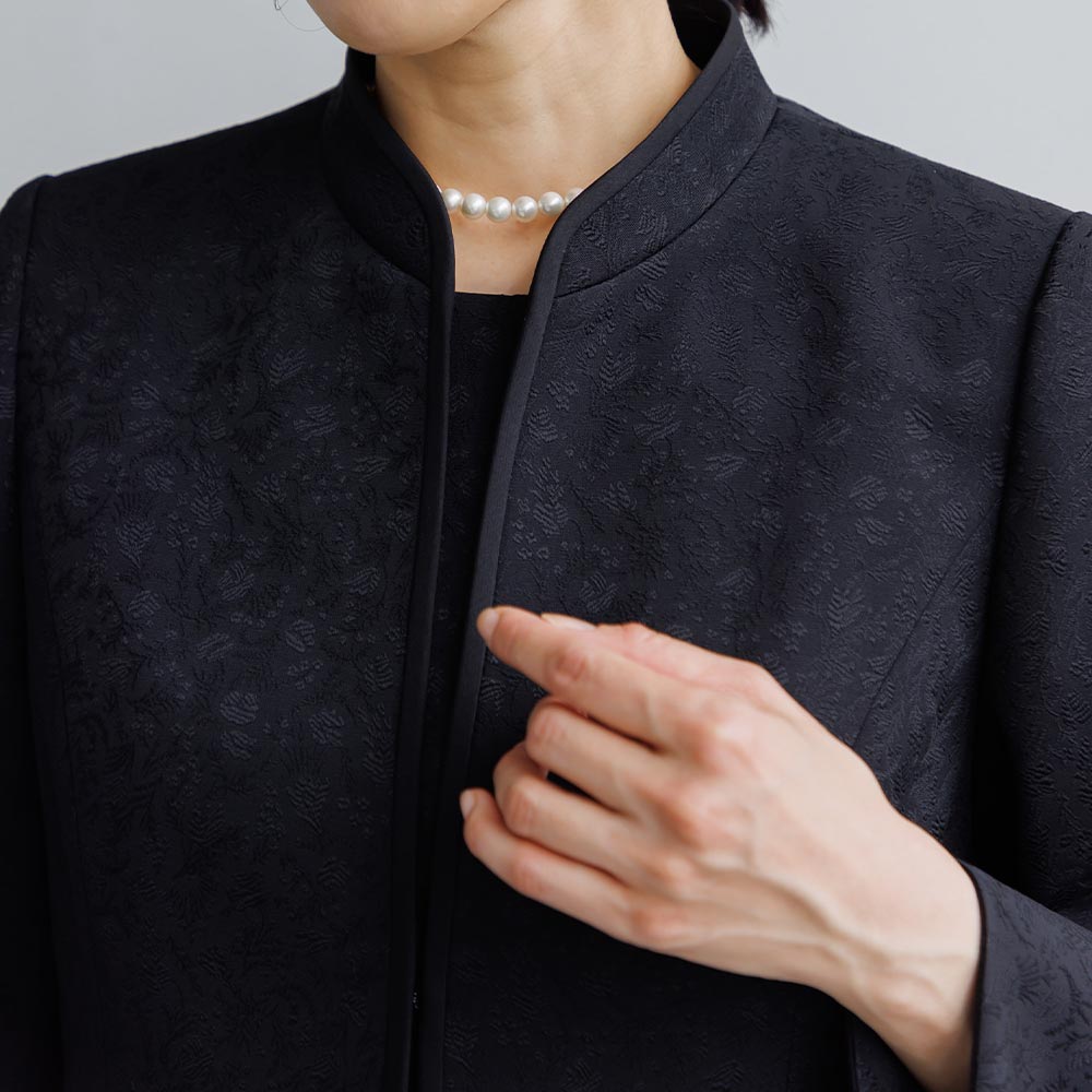 表地は立体感のある小花柄のジャカード素材を使用。上品な美光沢で大人エレガントな装いに。