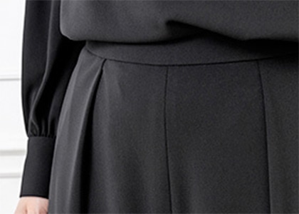 タックで実現したセンターラインは、伸縮性のあるニット生地では難しい技術。経験のあるパタンナーがミリ単位で調整しました。