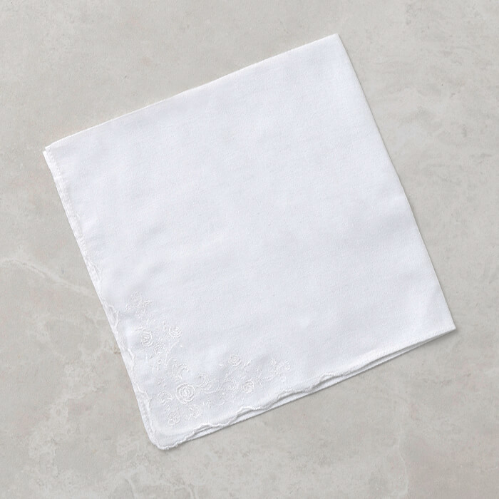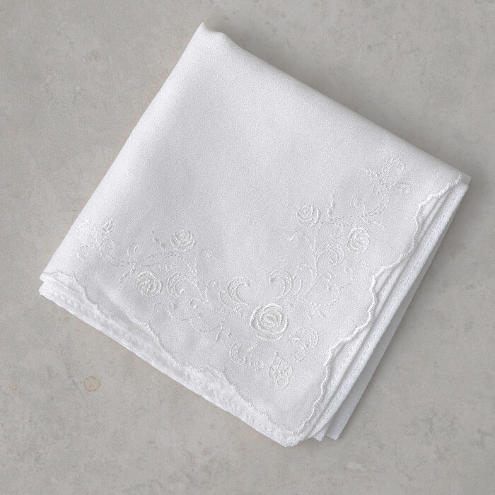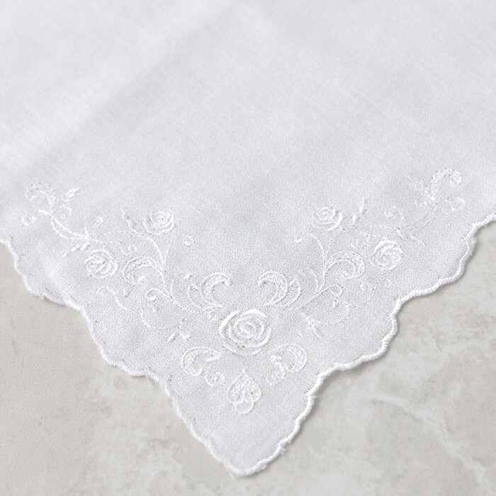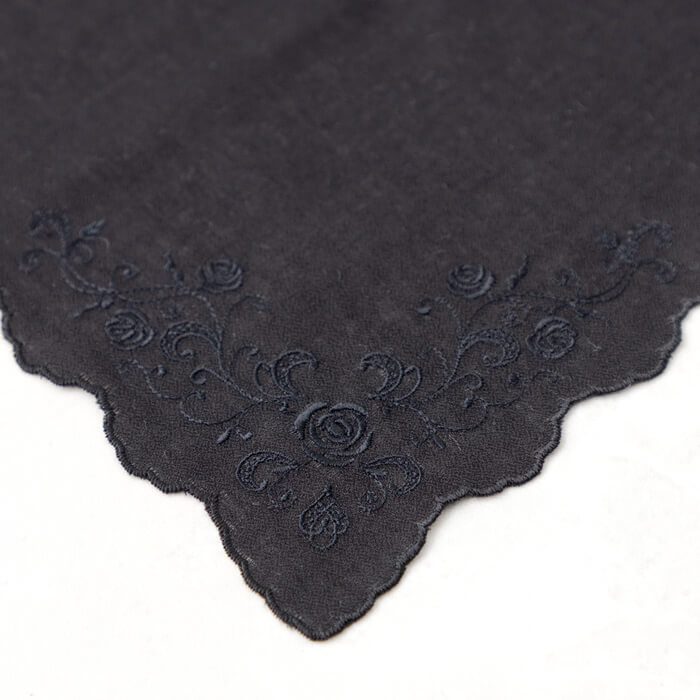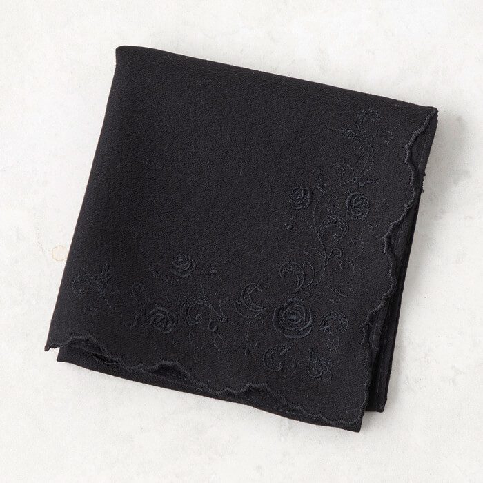 バラの花を思わせる繊細な刺繍をほどこしたハンカチは、白黒どちらを選んでも改まった席にぴったり。