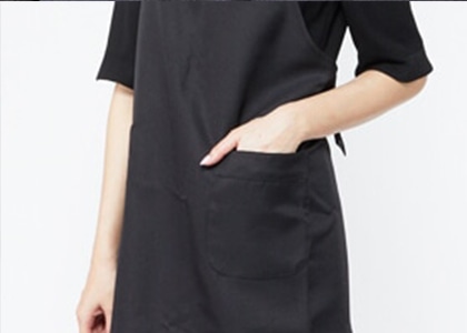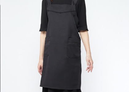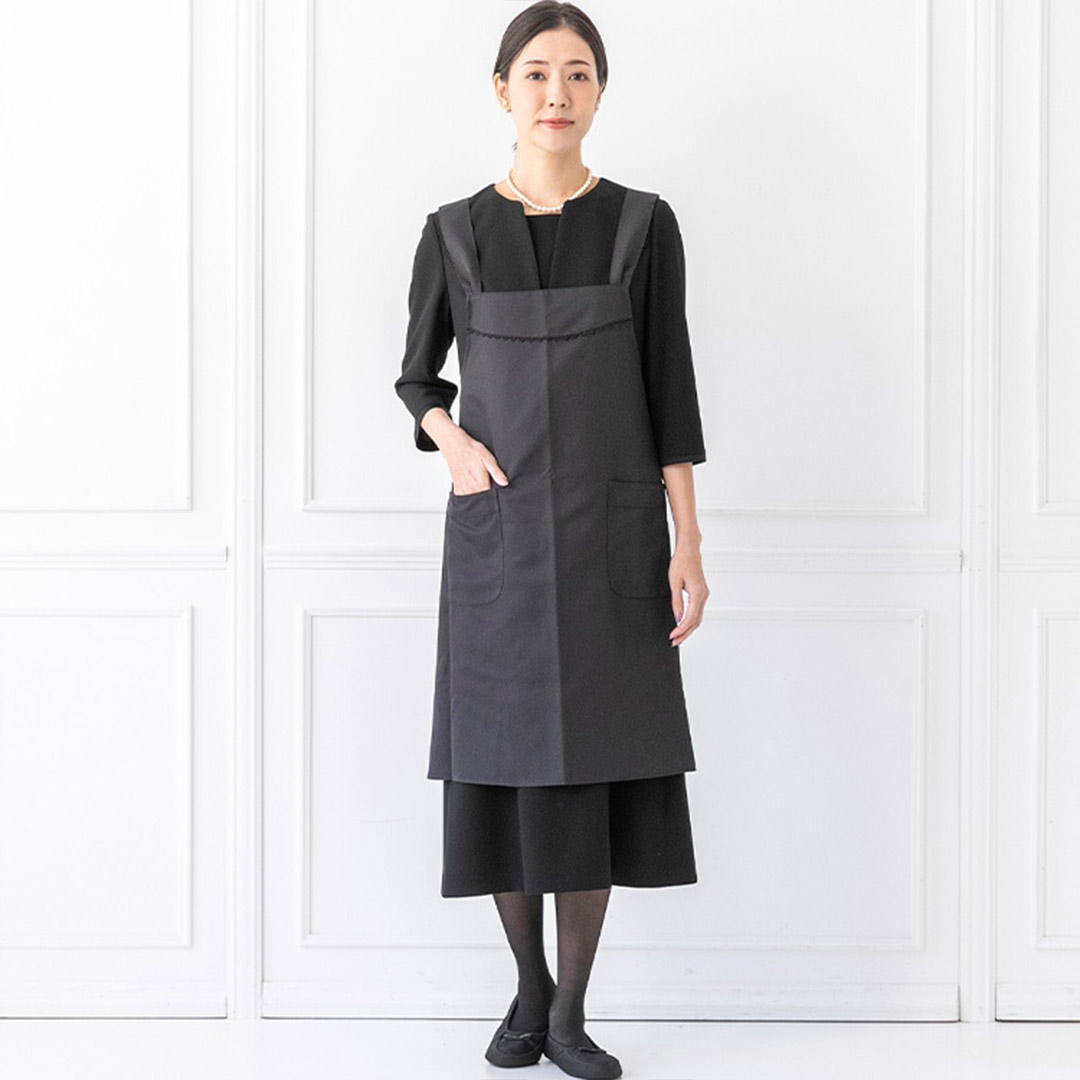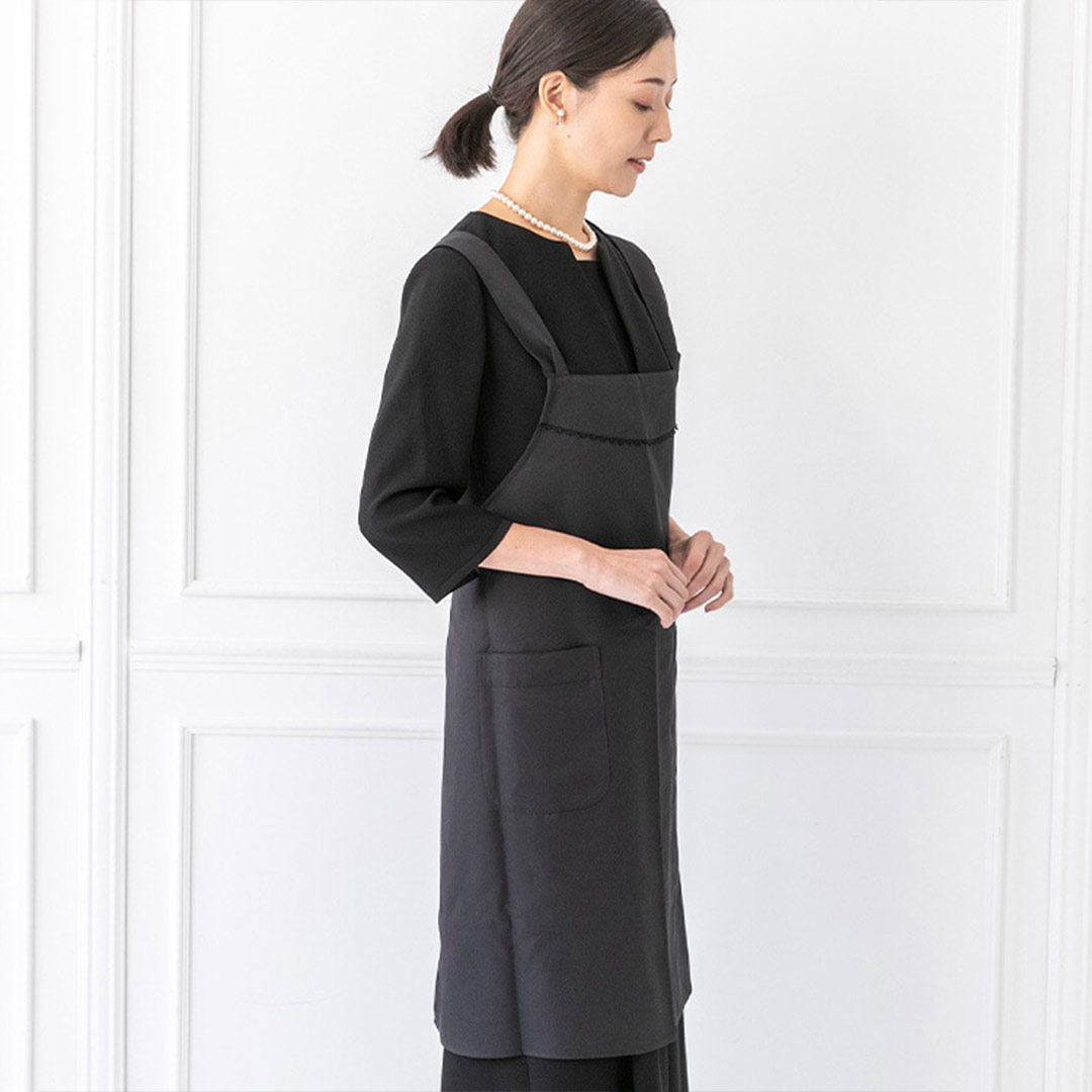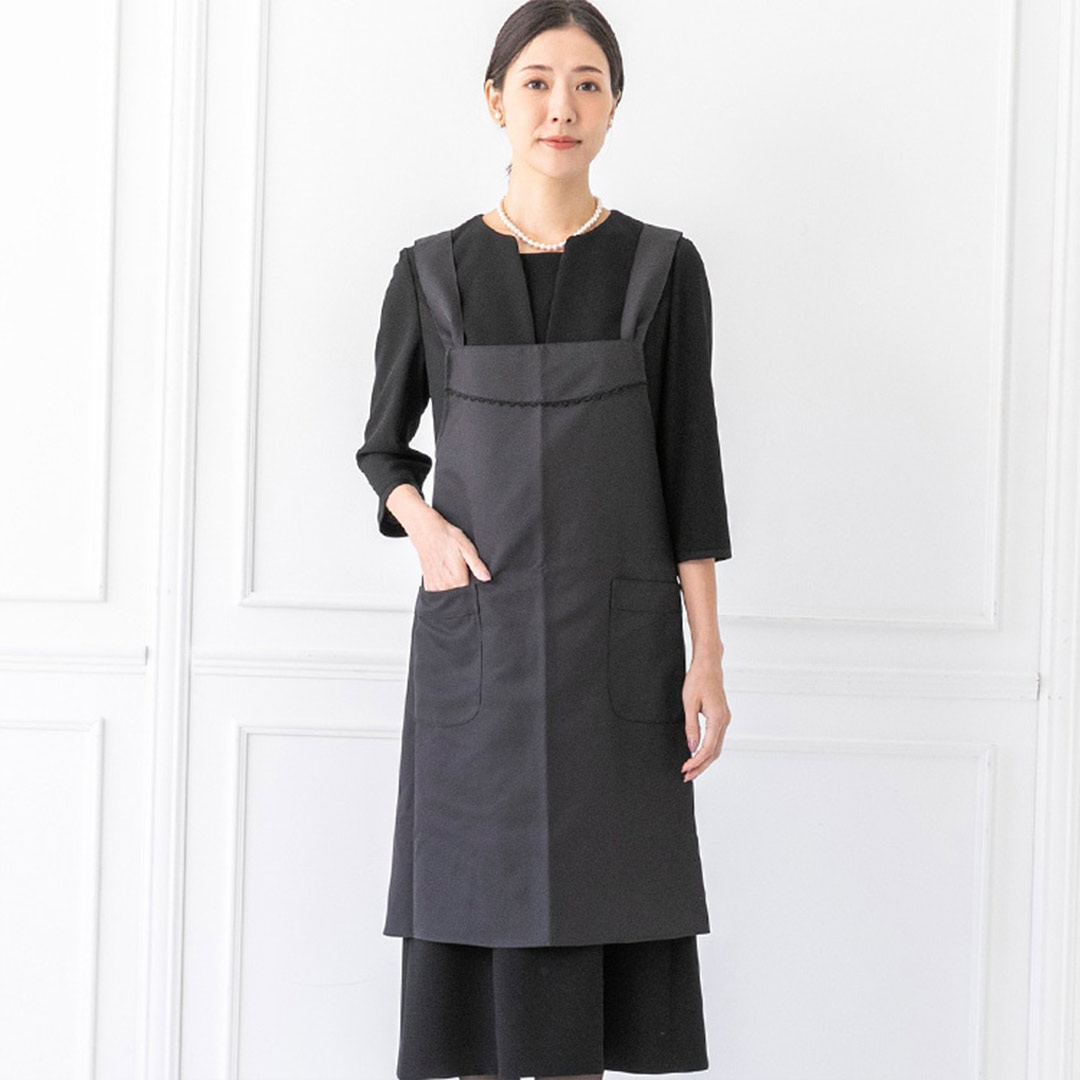 黒無地のエプロンは、探してみると意外と見つかりにくいもの。 シンプルなシルエットのエプロンは、弔事のお手伝いにも重宝しますので、一枚持っておくことをおすすめします。