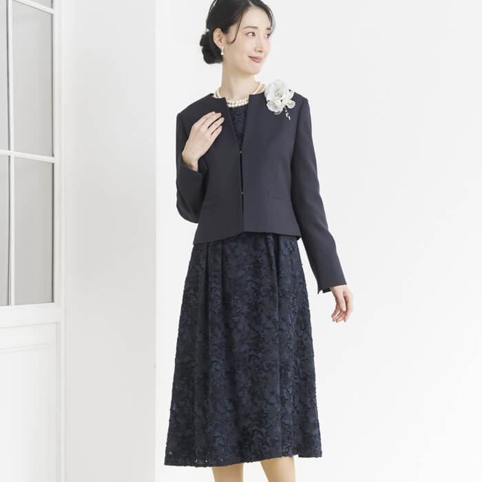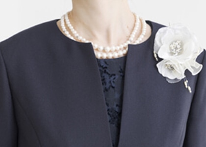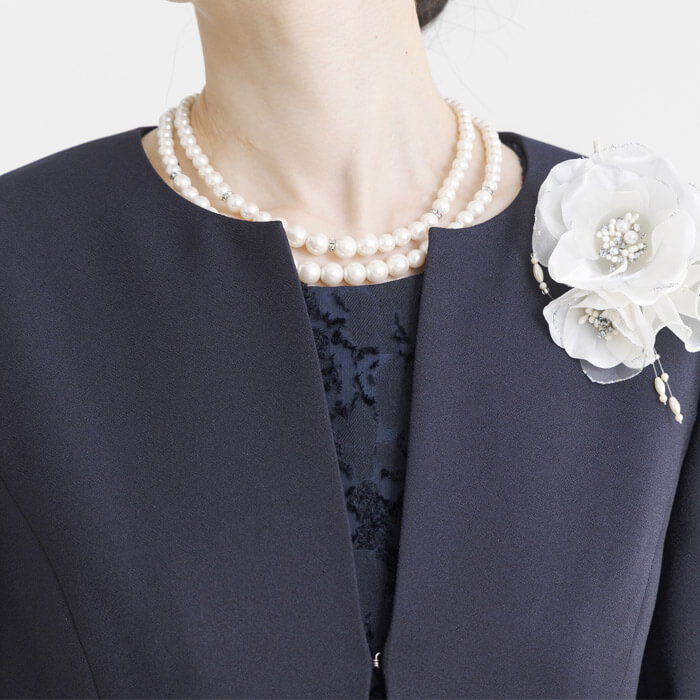 上品なノーカラージャケットできちんとした印象に。 ネックレスやコサージュで印象が変わります。